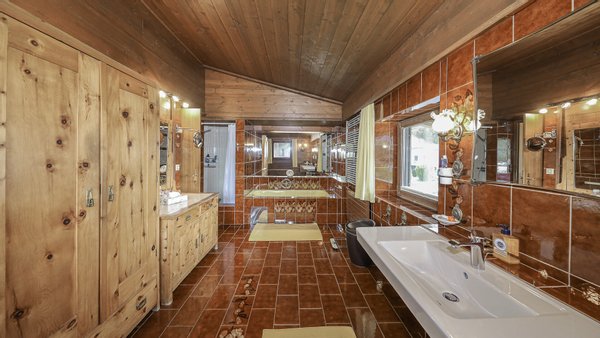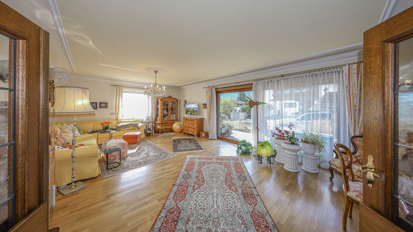 Über einen repräsentativen Vorplatz, auf welchem sich auch die Doppelgarage befindet, erreicht man das große Landhaus und betritt dieses im Erdgeschoss. Von der Diele mit angrenzender Garderobe gelangt man in den imposanten Vorraum mit Kamin und sodann in den großzügigen Wohnsalon mit schönem Kachelofen. Vom Wohnzimmer kommt man auf die Richtung Süden ausgerichtete Terrasse und den Garten. Weiters befinden sich im Erdgeschoss die komplett ausgestattete Küche mit Speis und angrenzendem Esszimmer, eine Gäste-Toilette sowie der Wellnessbereich mit Sauna, Dusche, WC und Vorbereitung für einen Pool, welcher aber nicht ausgeführt wurde.