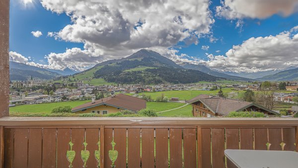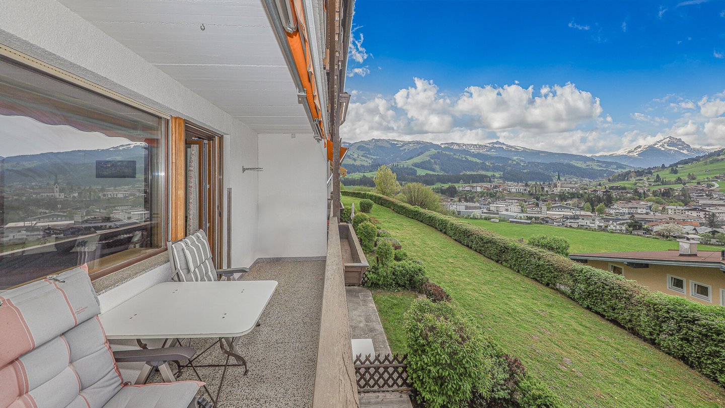 Vom Wohnzimmer gelangt man auf die ca. 8 m² große Loggia mit Fernblick über die Kitzbüheler Alpen.