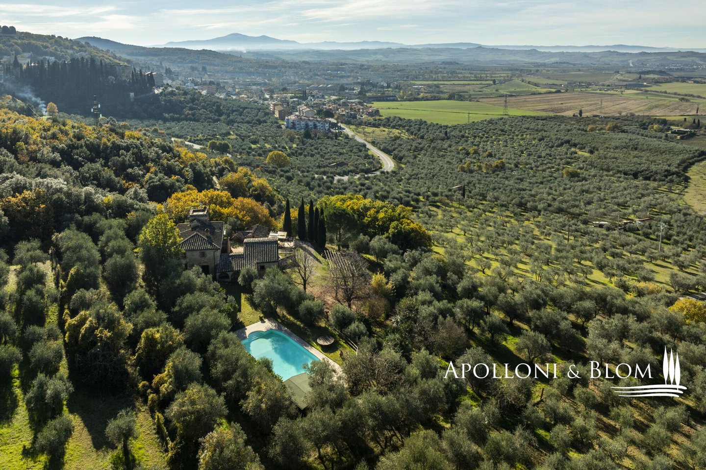 Typ: Bauernhaus von 464 m² auf fünf Ebenen mit Panoramaturm, Nebengebäude, Garage, Garten mit Schwimmbad, privater Zufahrtsstraße und 18,4 ha Olivenhain