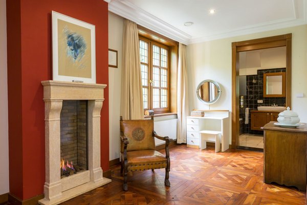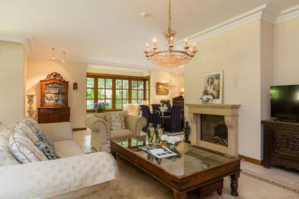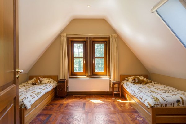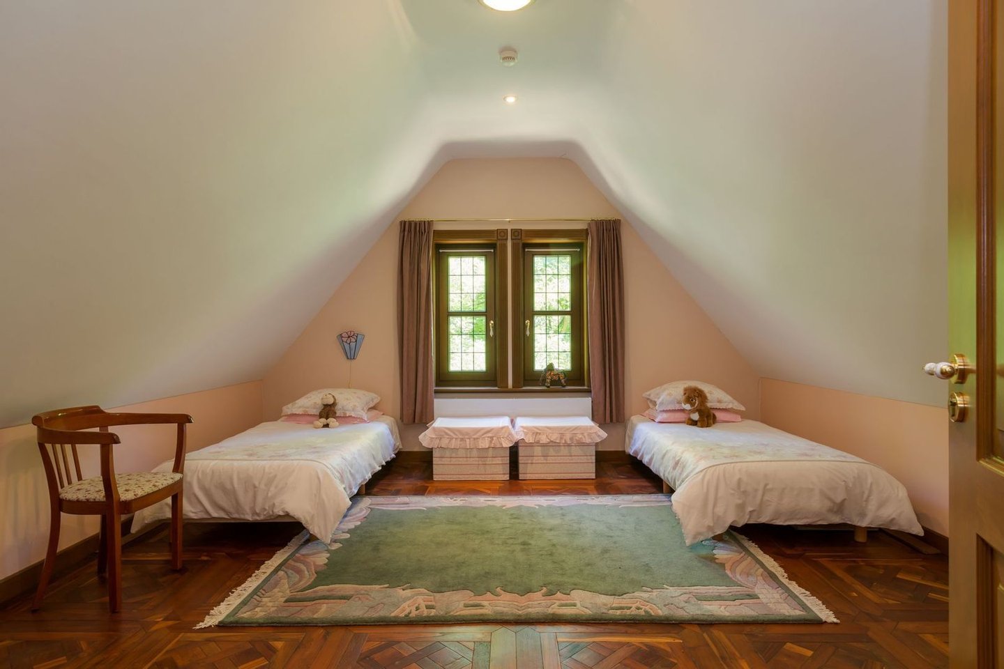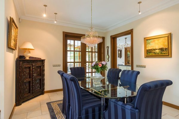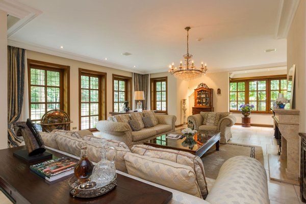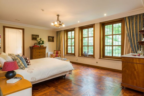 Despite its classic appearance, the villa is fully designed for modern family life. The ground floor is the heart of the house, with an inviting entrance hall and a spacious living room with charming bay windows and beautiful garden views. The kitchen, filled with English country charm, is a gathering place for family and culinary delights. An impressive AGA stove, a large dining table, and a cozy gas fireplace create a warm and inviting atmosphere. In the summer, the kitchen extends to a large garden terrace, perfect for long, sunny evenings.