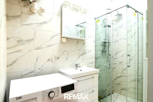 Das Badezimmer ist mit einer Dusche sowie einer Waschmaschine ausgestattet. Das WC ist separat angeordnet.