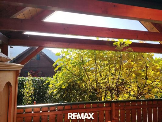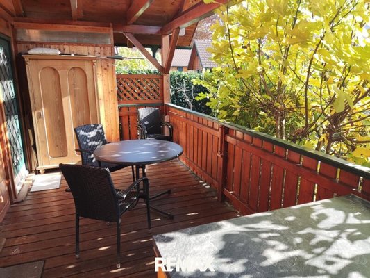 Die nach Süden ausgerichtete Terrasse spendet ganztägig Wärme und Wohlbefinden. Dies ist ein ideales Fleckchen für gesellige Zusammenkunft sowie ein Genuss im Sonnenschein.