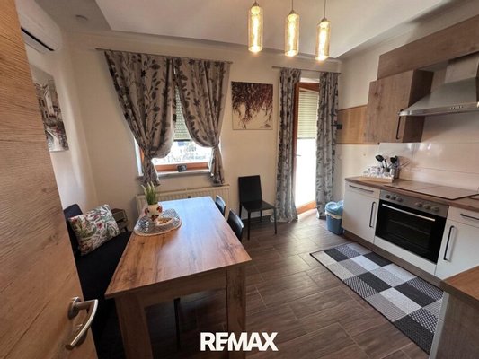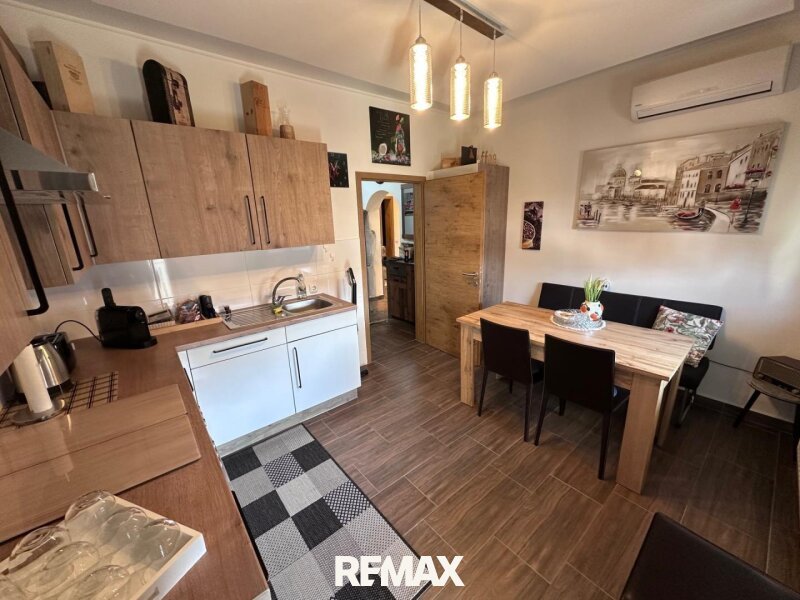Der Essraum ist mit einer Einbauküche und sämtlichen Elektrogeräten ausgestattet. Von dort gelangen Sie direkt auf den Balkon.