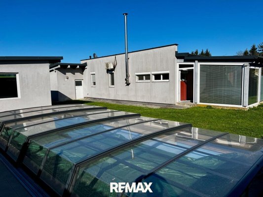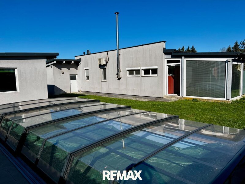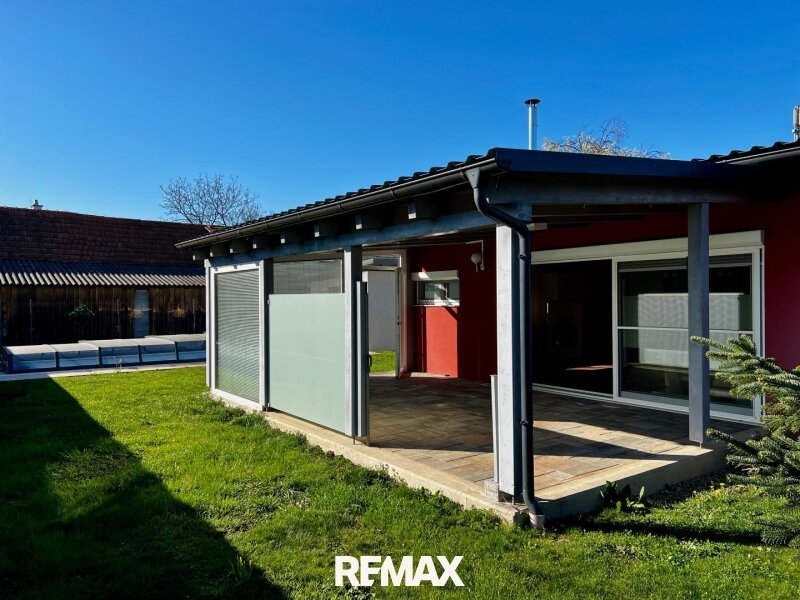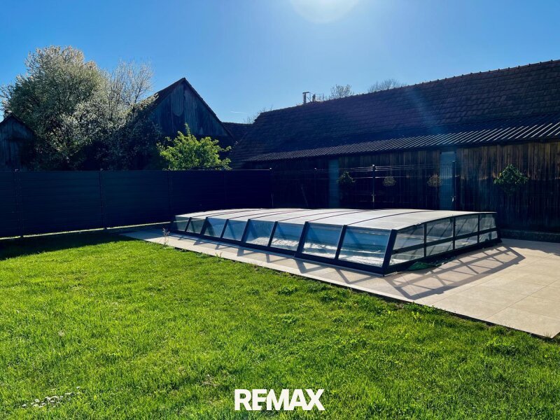 Das rund 800 m² große Grundstück ist liebevoll gestaltet und bietet ausreichend Platz für Erholung und Freizeit. Besonders hervorzuheben ist die großzügige, gepflasterte Terrasse, die überdacht ist und an zwei Seiten vollständig verglast wurde. Dadurch entsteht ein geschützter, ganzjährig nutzbarer Außenbereich mit hoher Wohnqualität. Der Pool sowie die Terrasse laden zum Entspannen ein und machen das Objekt zu einer echten Wohlfühloase.