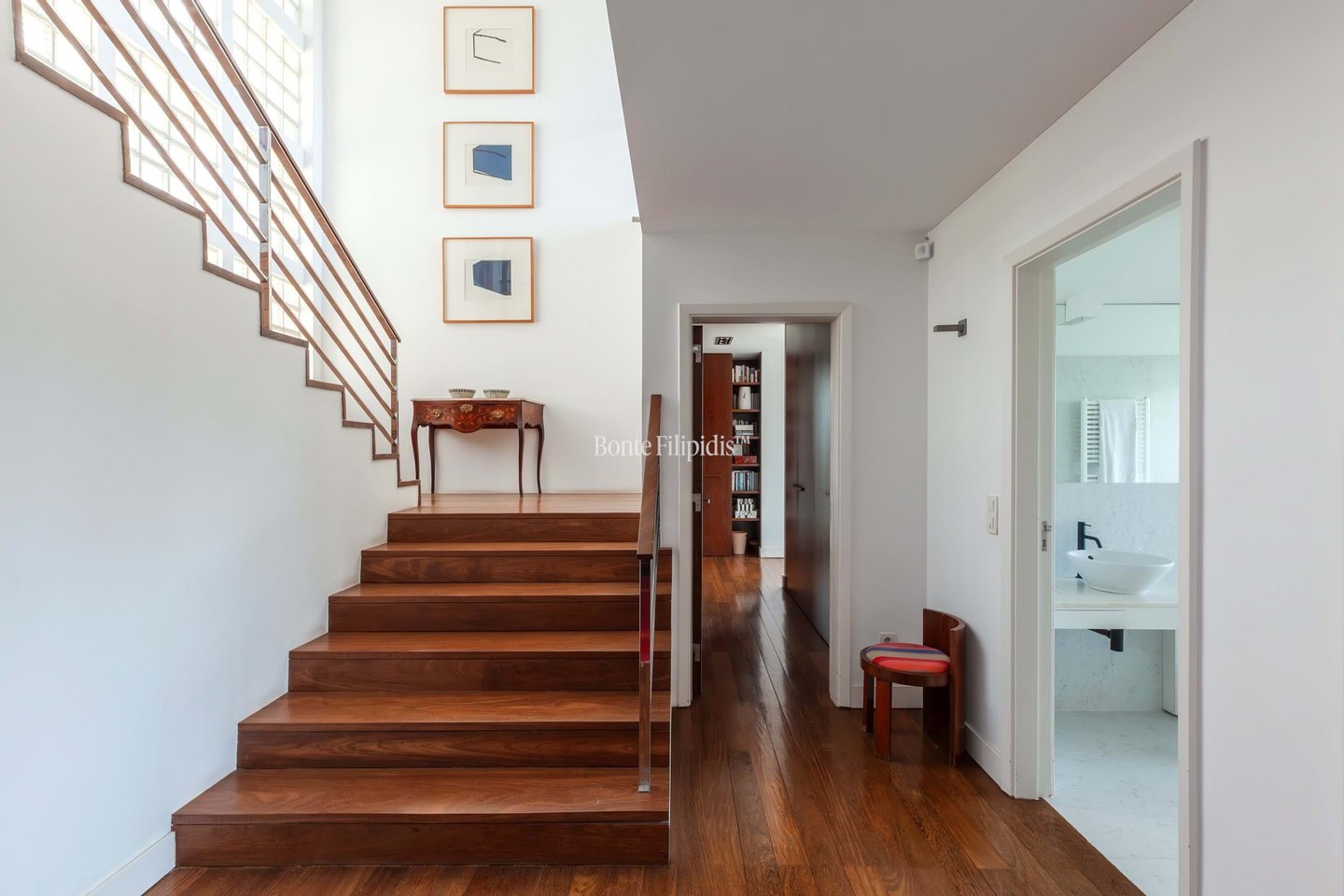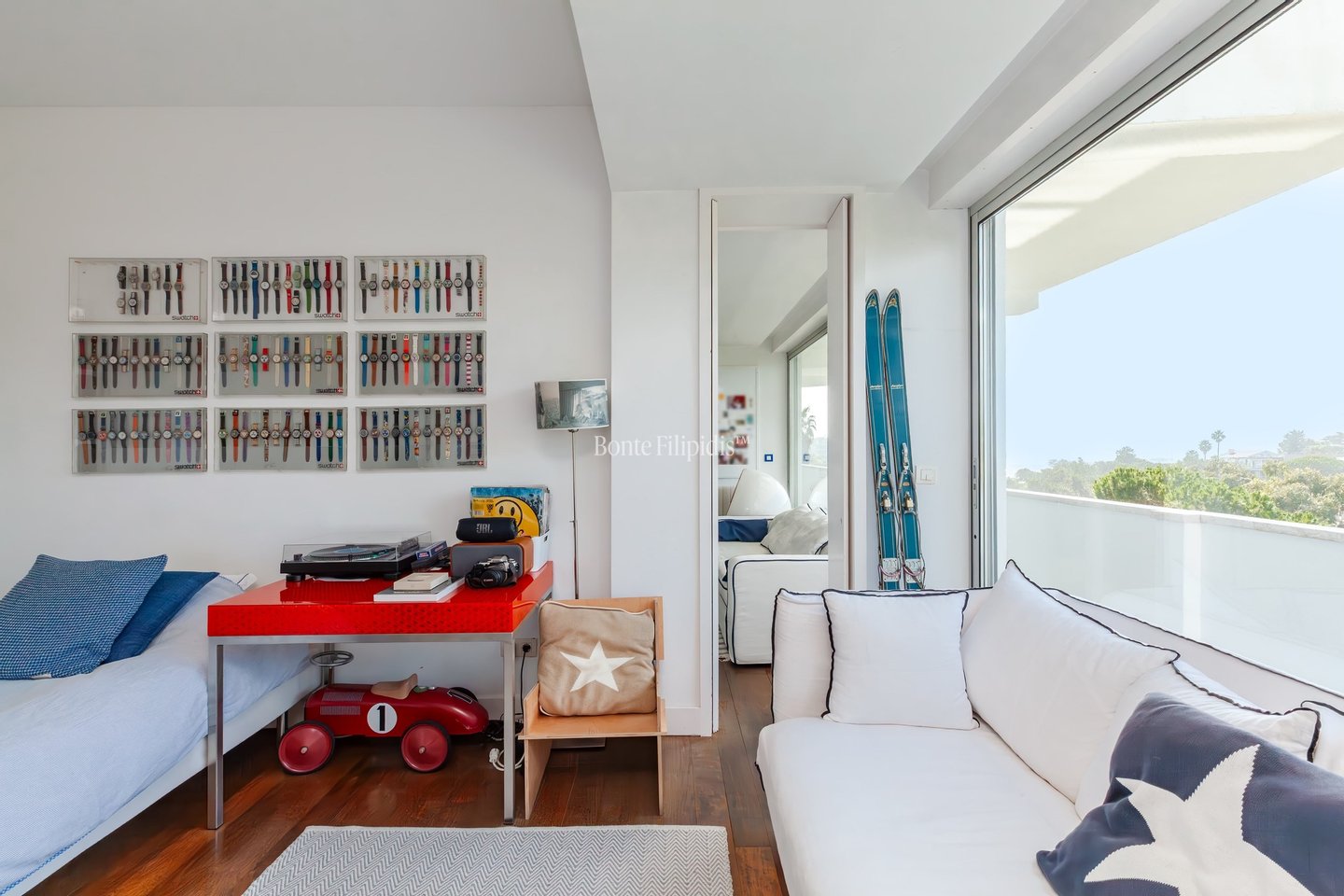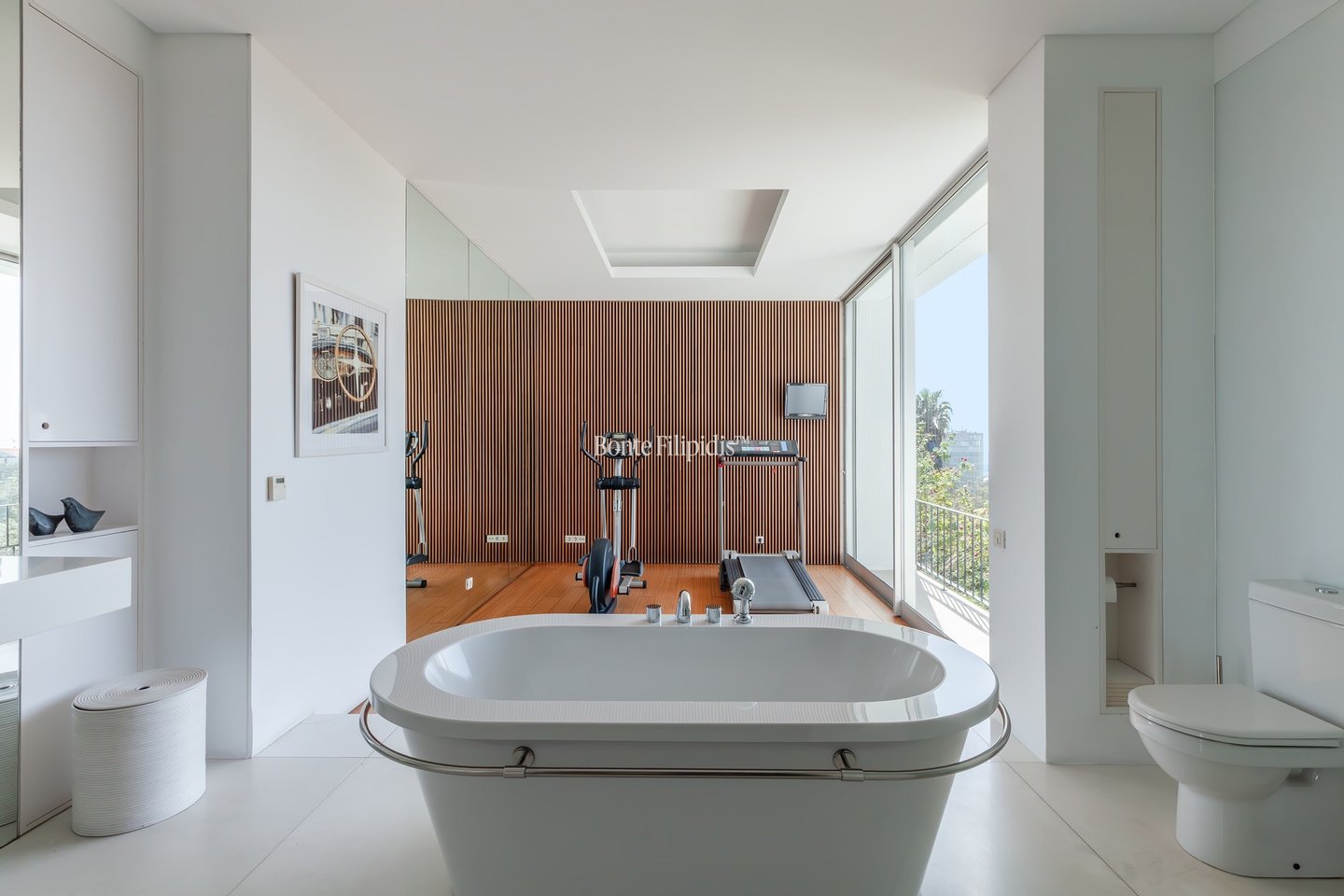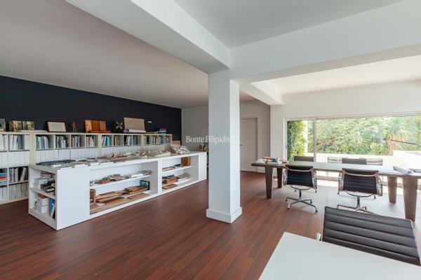 The bedroom level is dedicated to privacy and comfort. The primary suite enjoys its own terrace with ocean views and features a walk-in wardrobe, ensuite bathroom, and a dedicated gym area. Three additional bedrooms share a sea-view terrace and are served by two bathrooms. A distinctive element of the property is the 216 sqm atelier floor with potential independent access. This highly versatile space can be adapted to a variety of uses, including a guest apartment, private wellness area, home office, studio, cinema room, or a separate living area for teenagers or visitors.