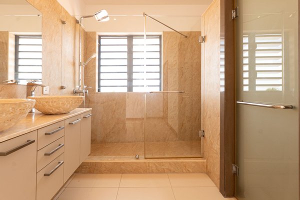Eine zweite, zum Wohnraum offene Küche ergänzt das Konzept und sorgt für zusätzlichen Komfort im Alltag. Der Schlafbereich umfasst drei stilvolle Schlafzimmer, darunter zwei En-Suite-Zimmer, alle mit Einbauschränken und Klimaanlage ausgestattet, sowie ein Büro, das flexibel genutzt werden kann.