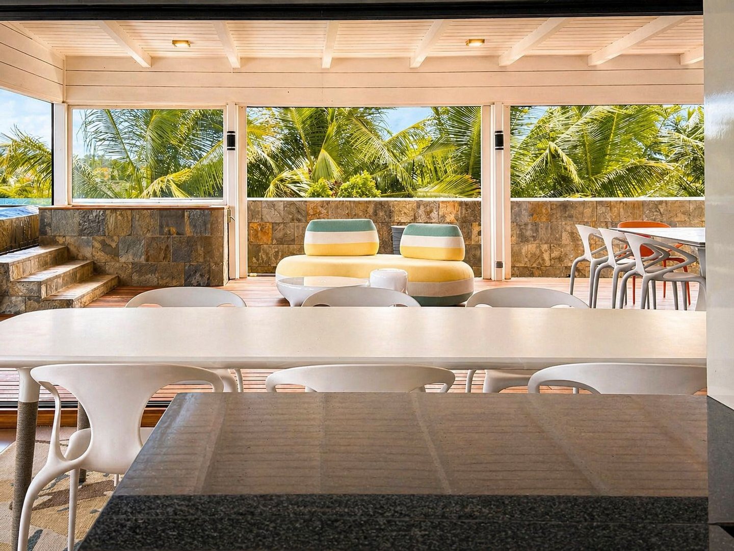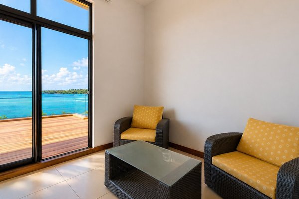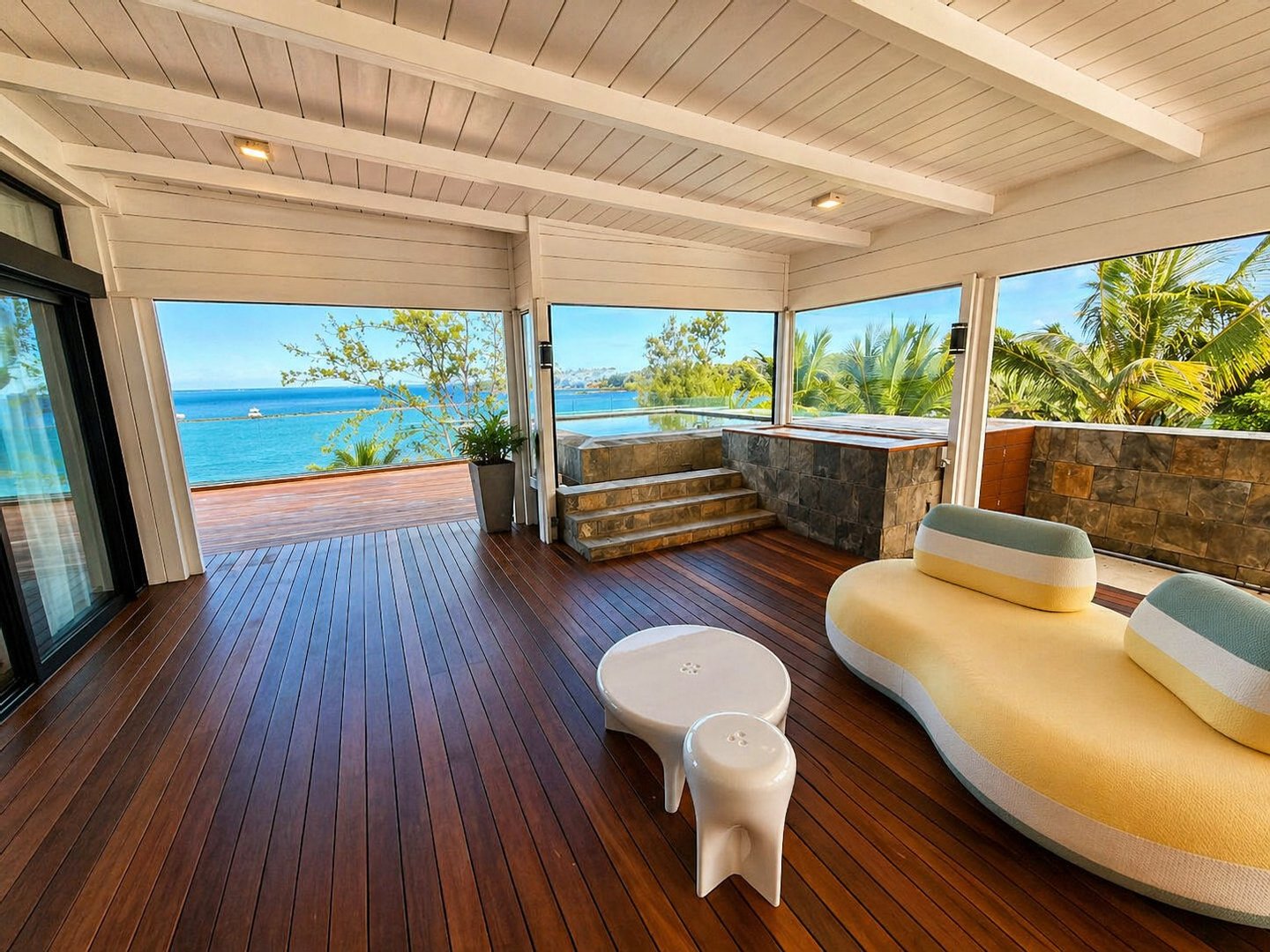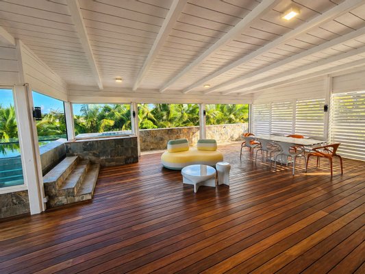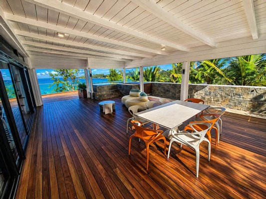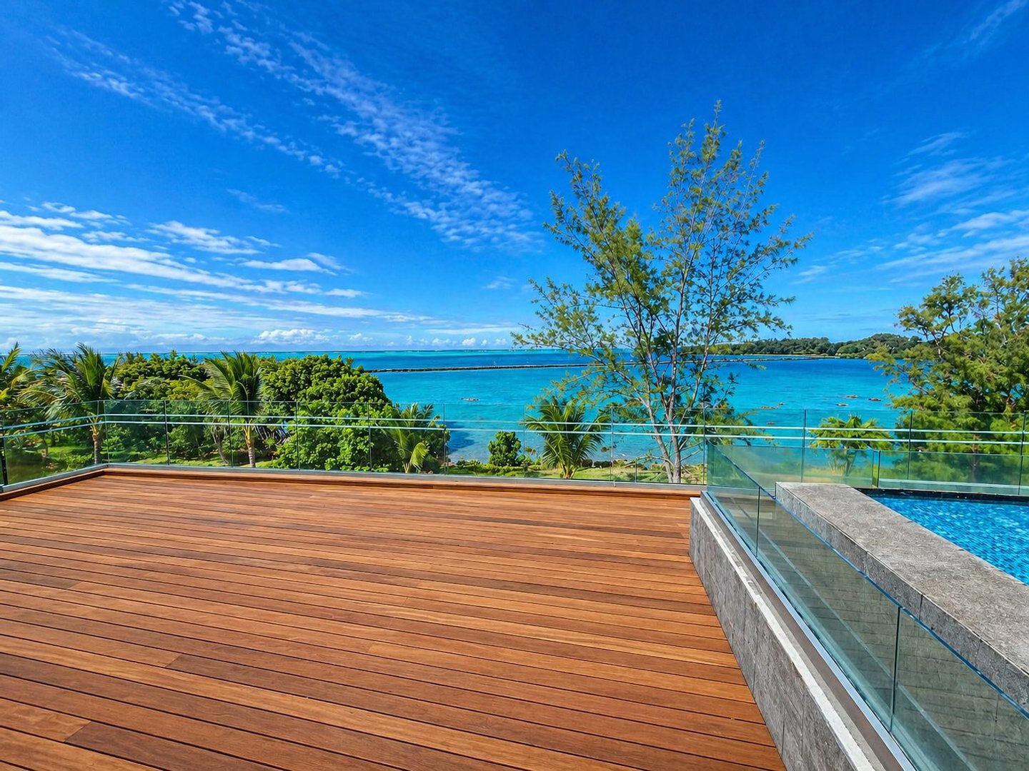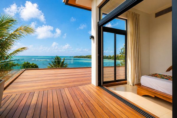 Die umlaufenden Teakholzterrassen schaffen mehrere Wohn- und Entspannungsbereiche, alle mit Blick auf die spektakuläre Lagune. Ein absolutes Highlight ist der private Pool, von dem aus Sie jeden Morgen den Sonnenaufgang in einer einzigartigen Kulisse genießen können.