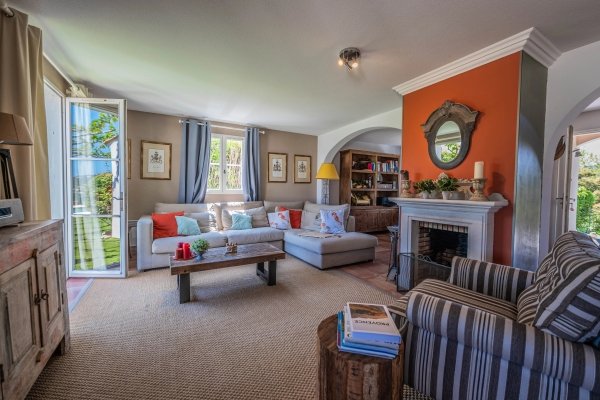 It consists of an entrance hall with guest toilets and dressing room, a large living room with dining area and office space, as well as an open kitchen, furnished and fully equipped. The whole opens onto a beautiful terrace with awnings and a heated free-form swimming pool.