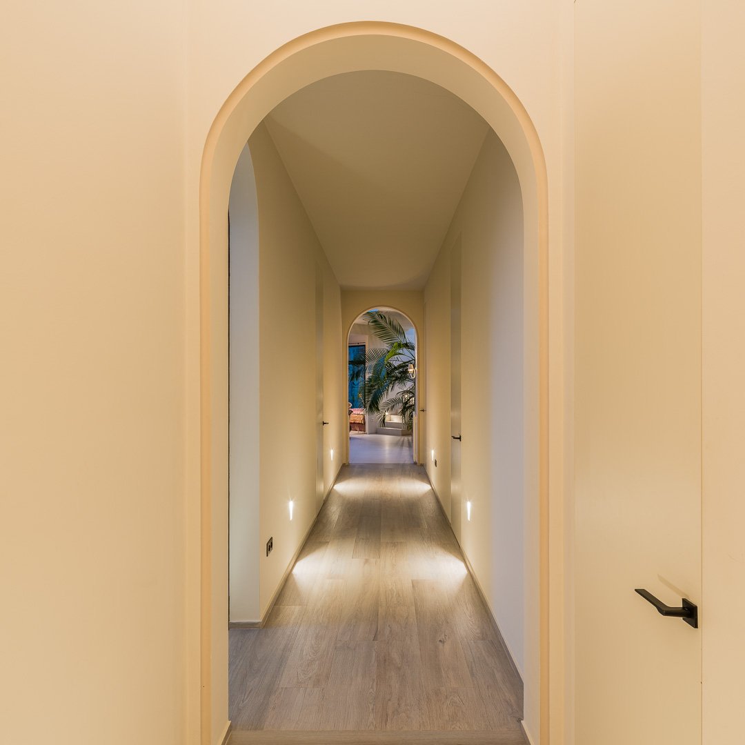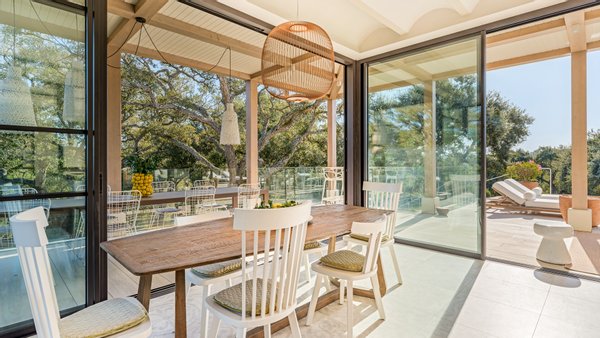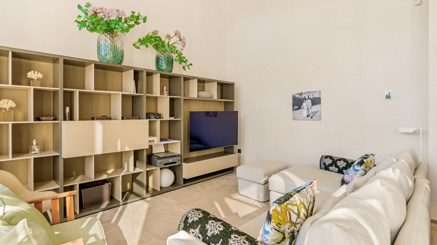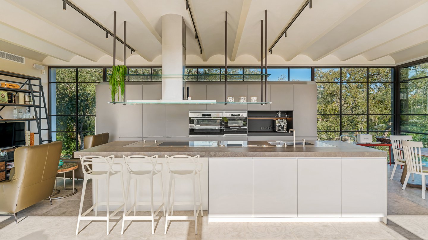 Designed with a clear sense of balance, the home embraces light, space and flow. High ceilings and large glass doors allow natural light to move freely throughout the interiors, connecting the living spaces effortlessly with the outdoors. The main living room feels both open and intimate, leading naturally towards the terraces and garden beyond. A separate dining area and a modern, fully equipped kitchen create a setting that adapts easily — from quiet mornings to evenings spent hosting.