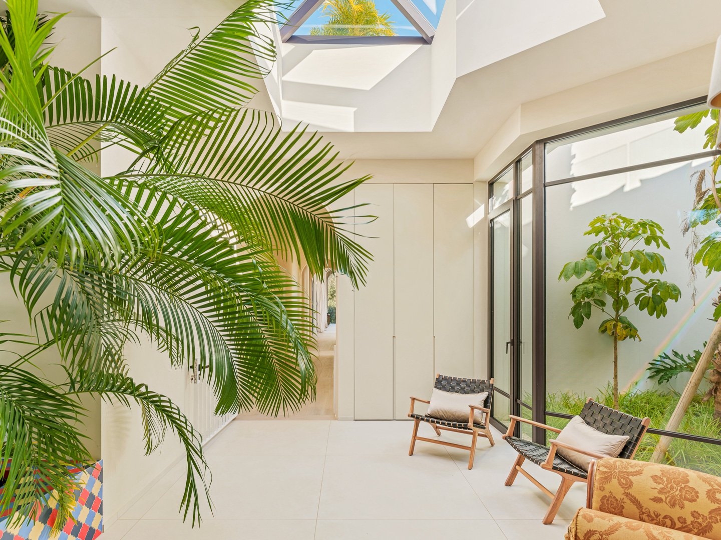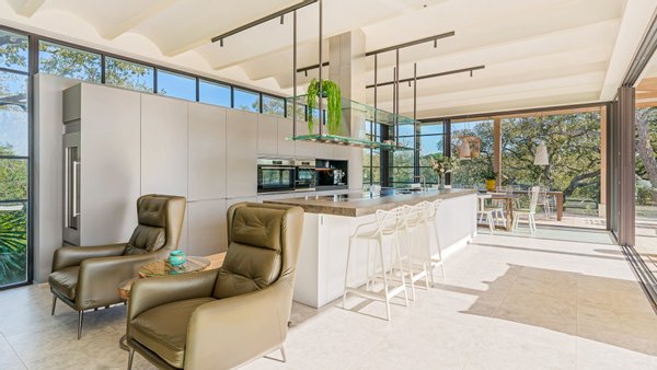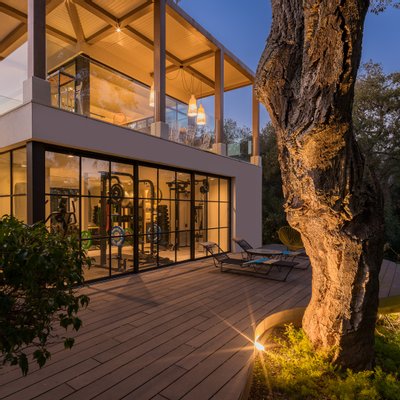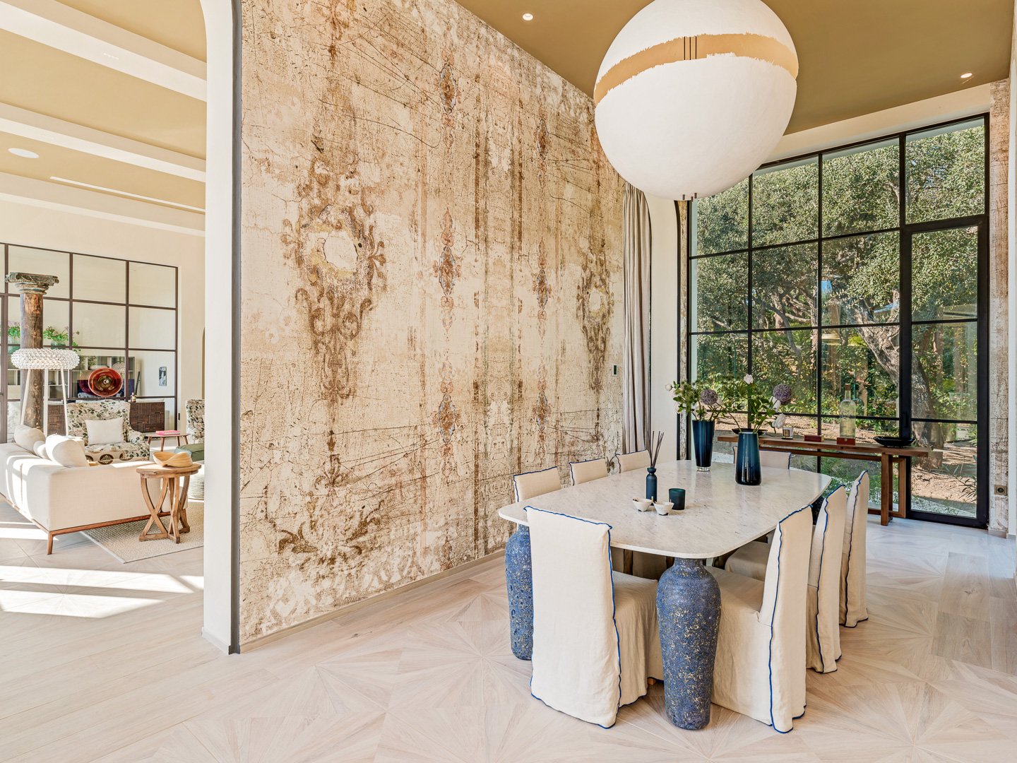 Designed with a clear sense of balance, the home embraces light, space and flow. High ceilings and large glass doors allow natural light to move freely throughout the interiors, connecting the living spaces effortlessly with the outdoors. The main living room feels both open and intimate, leading naturally towards the terraces and garden beyond. A separate dining area and a modern, fully equipped kitchen create a setting that adapts easily — from quiet mornings to evenings spent hosting.