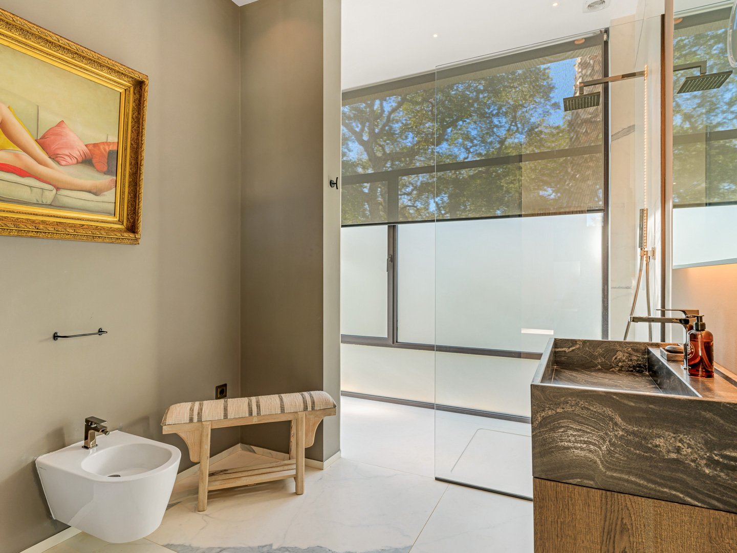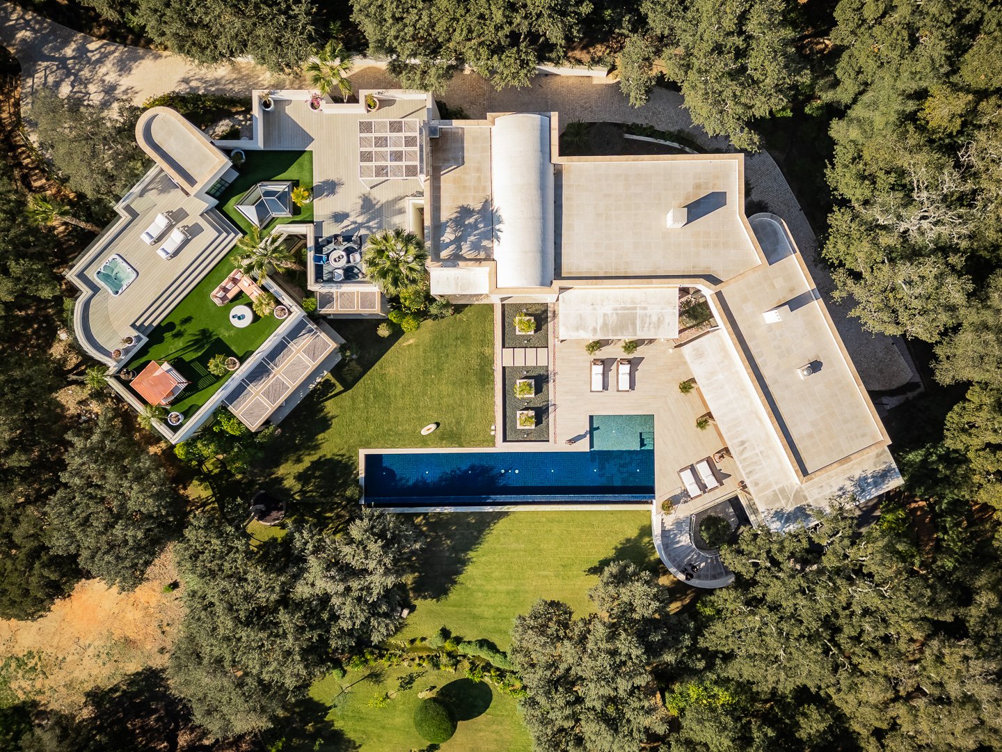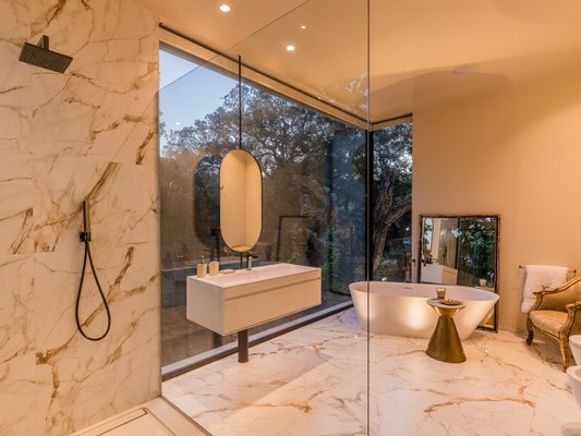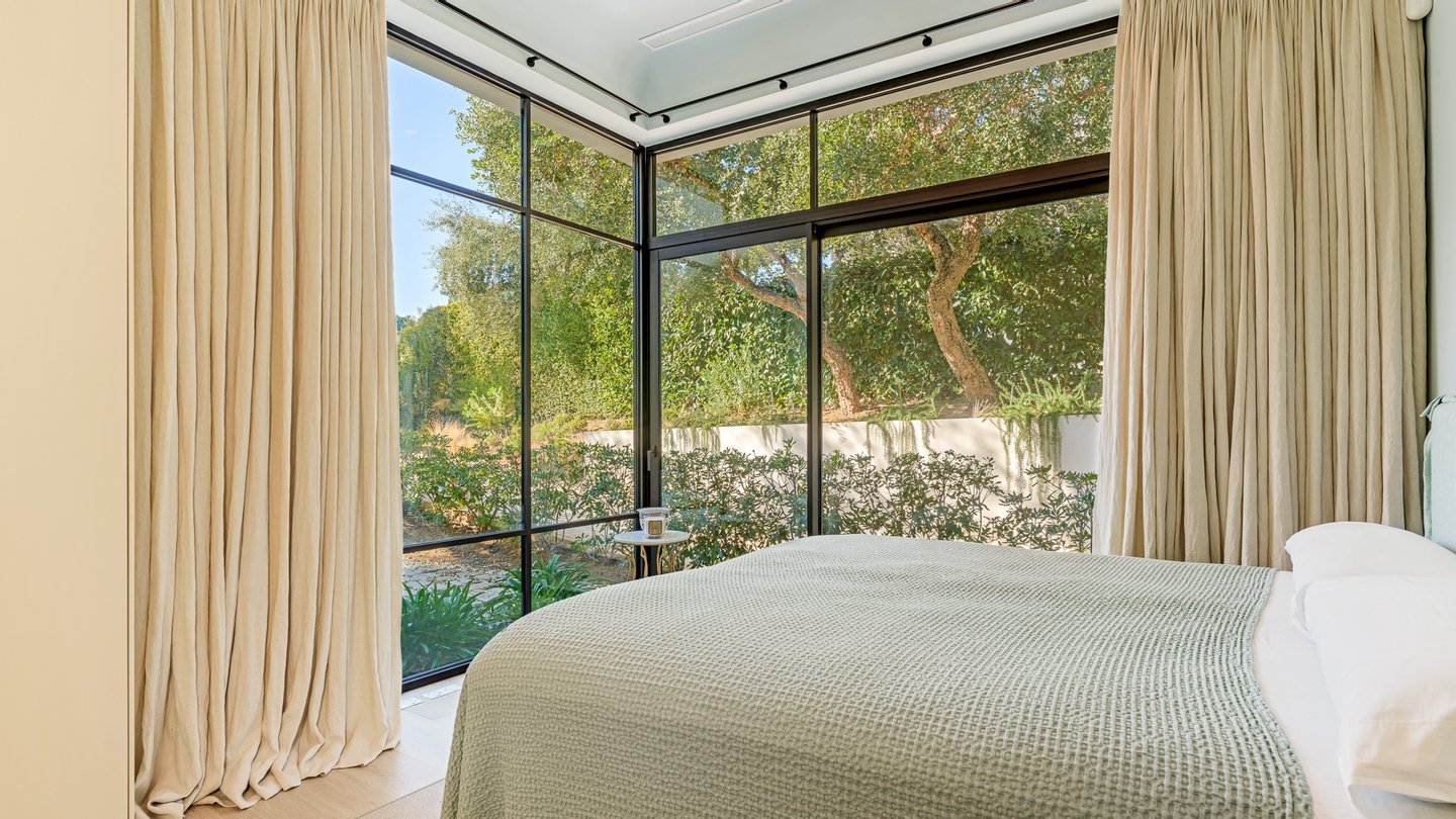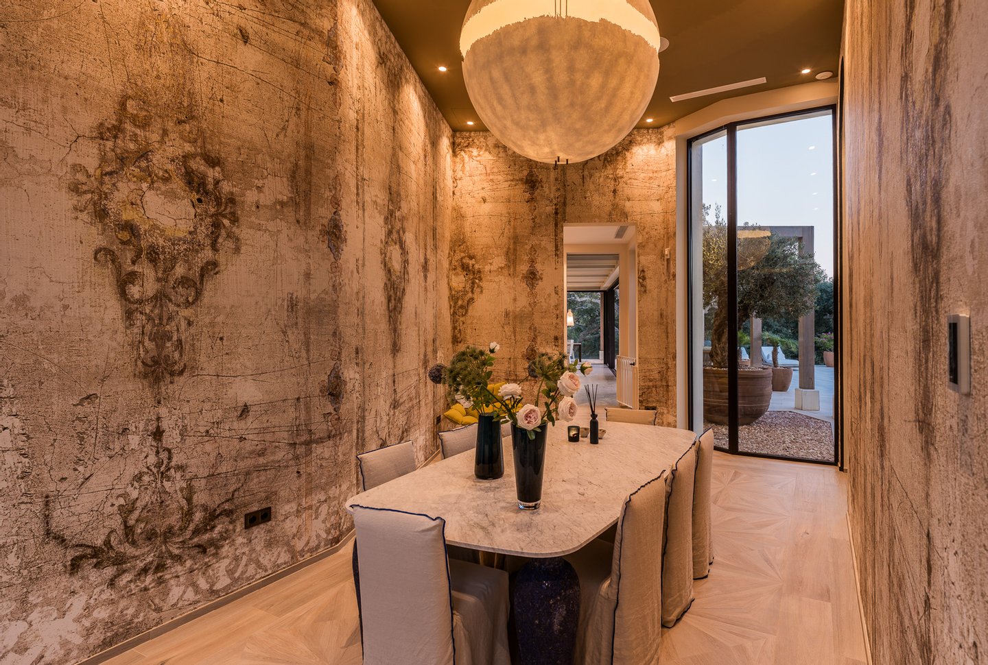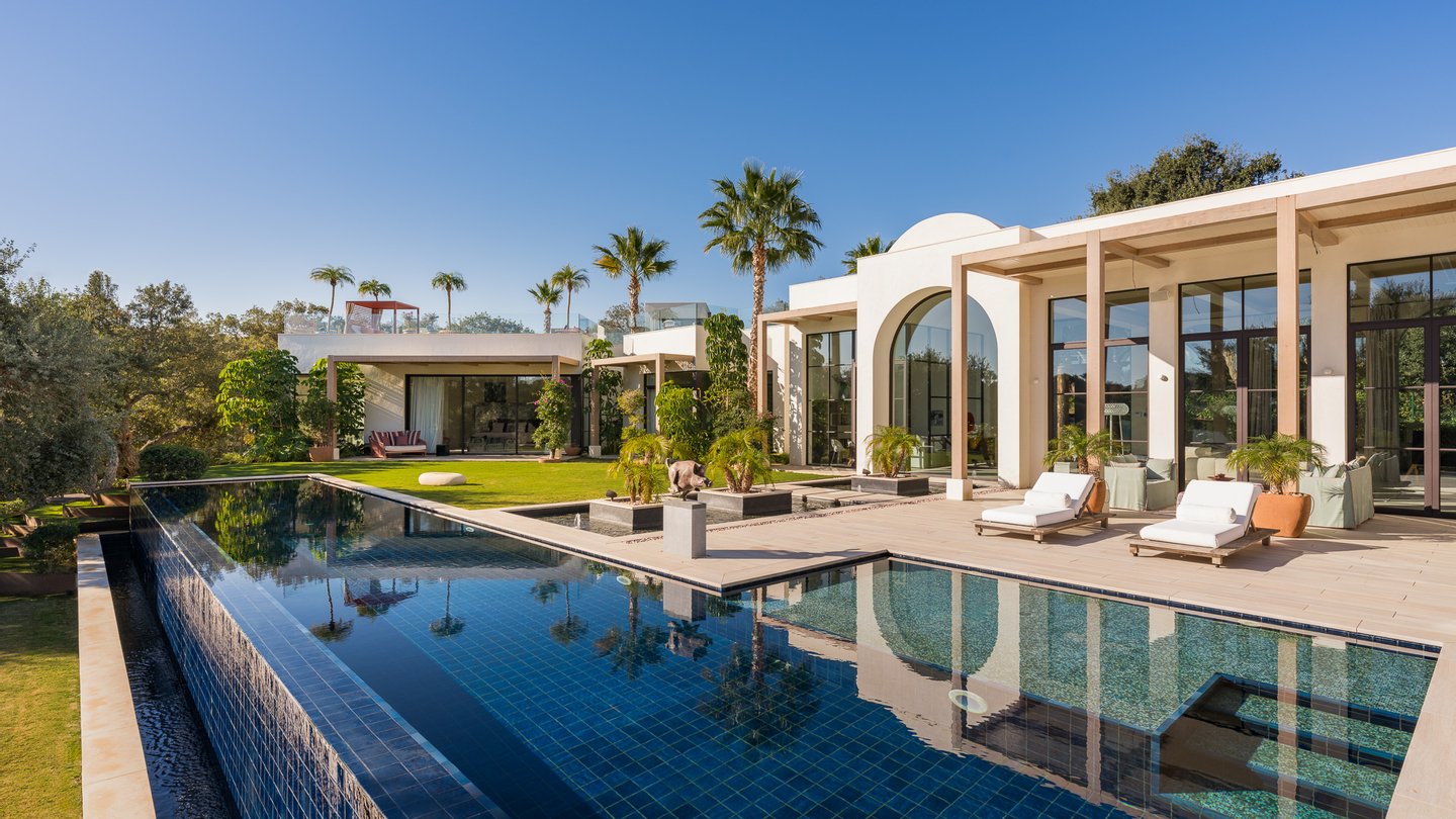 The villa offers six bedrooms, each with its own sense of privacy. The master suite stands apart, complete with two bathrooms, creating a space that feels calm and personal. Throughout the home, additional spaces — a study, gym, sauna and wine cellar — add depth to everyday living, offering moments of retreat as well as connection.