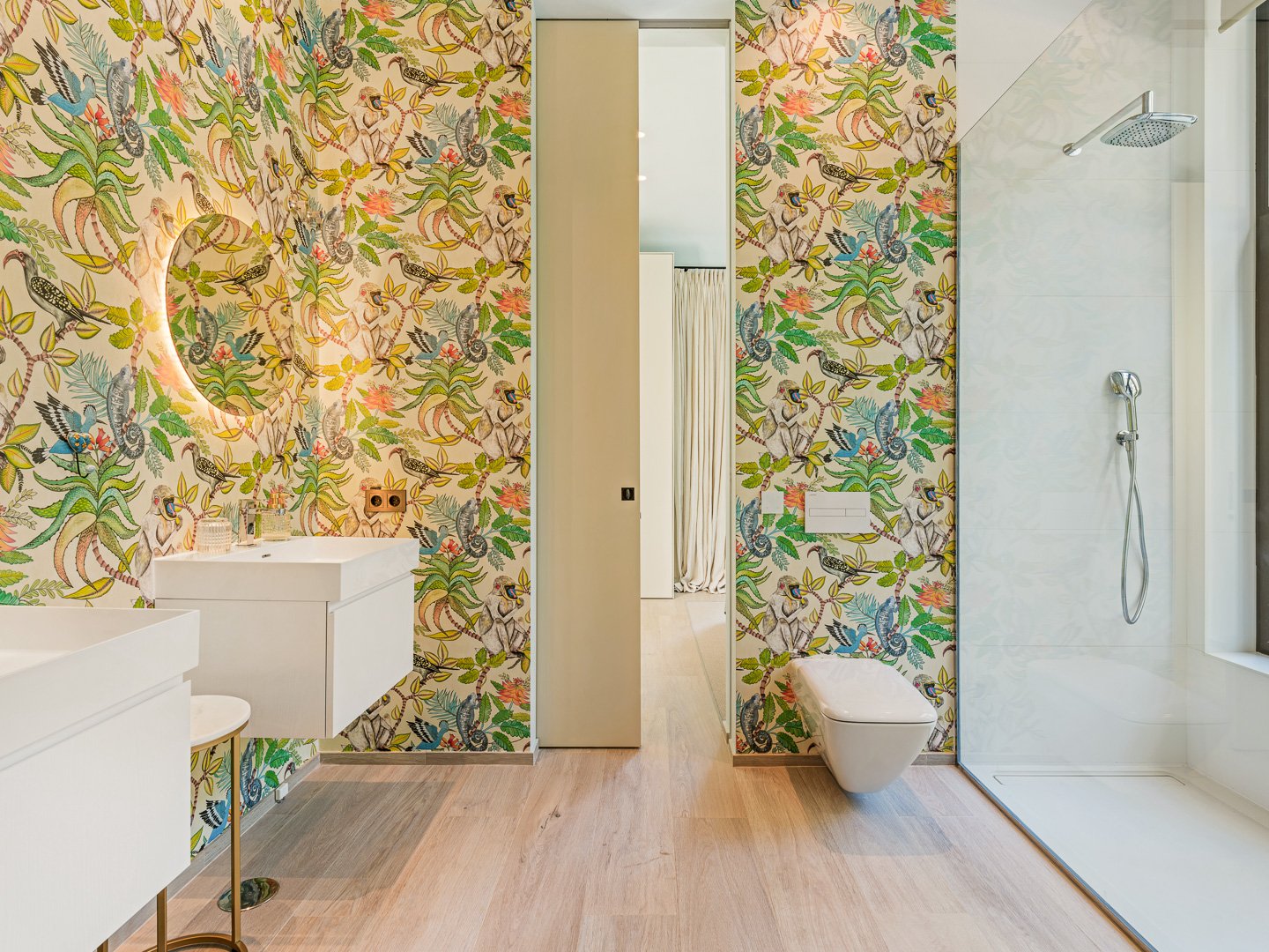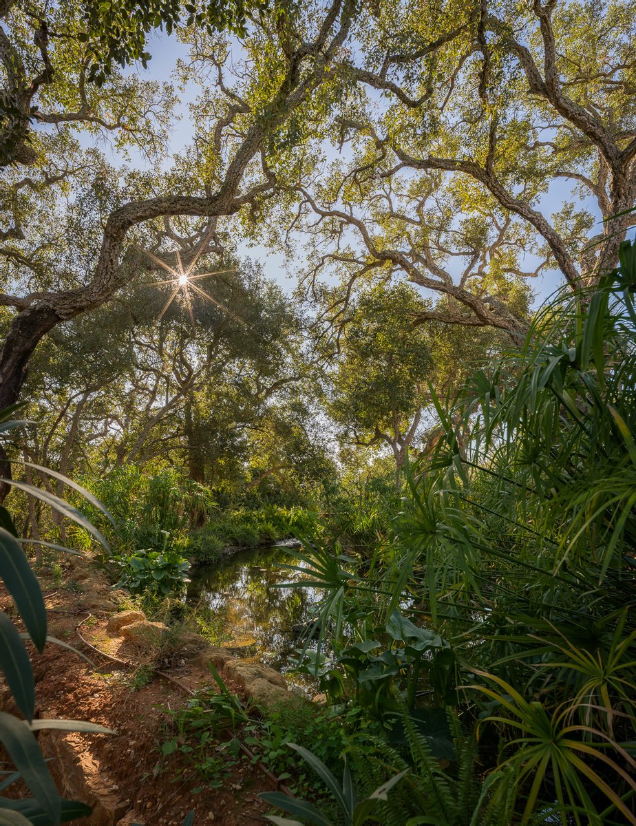 Outside, the atmosphere remains consistent. A centrally positioned swimming pool anchors the garden, while a private stream gently runs through the property, adding a subtle, almost meditative quality to the surroundings. Covered and open terraces provide space throughout the day, always with views towards the greenery.