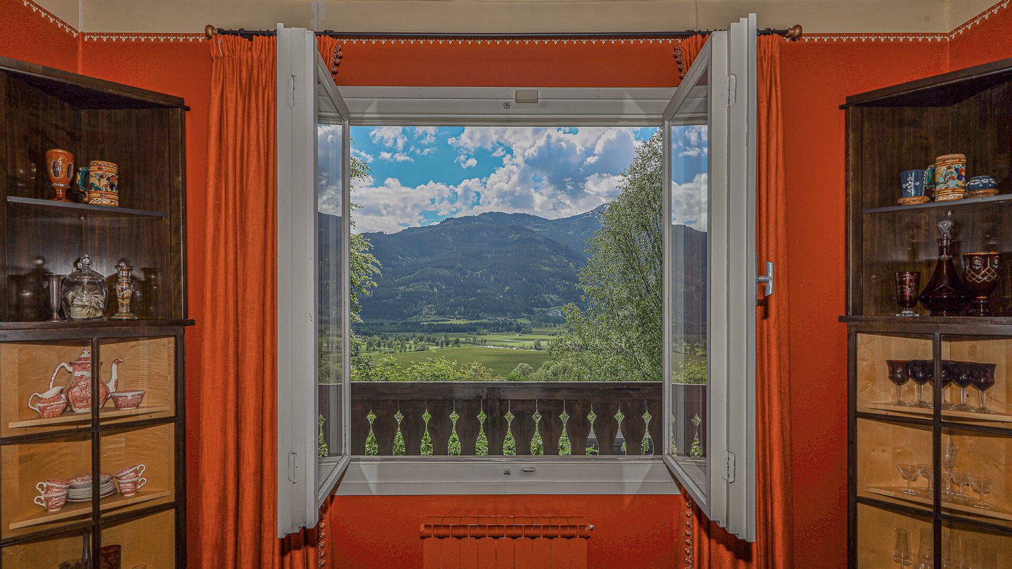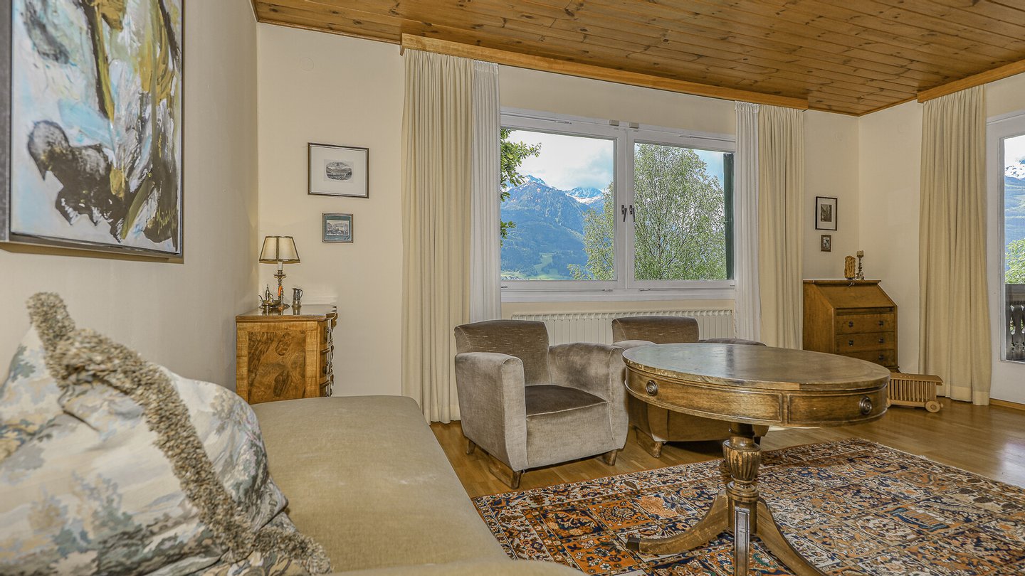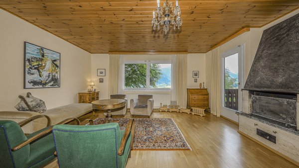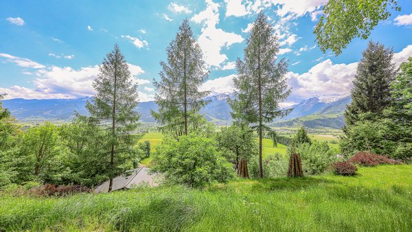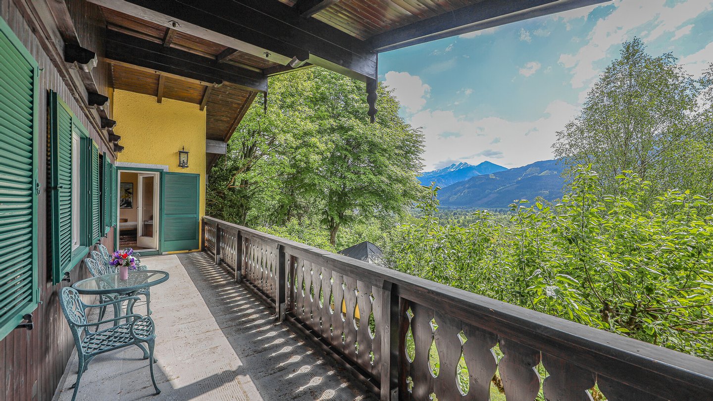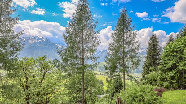 Vom Wohnzimmer kommt man auf den südseitig gelegenen Balkon mit einem phantastischen über 180-Grad Rundumblick auf die Bergwelt und die Natur. Weiters gelangt man über einen Ausgang auf die Terrasse und in den Garten.