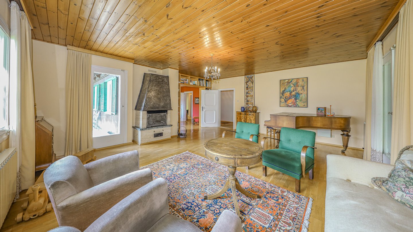 Sodann erreicht man den schönen Wohnbereich mit Kamin und Ausblick und über einen breiten Durchgang gelangt man in das geräumige Esszimmer.