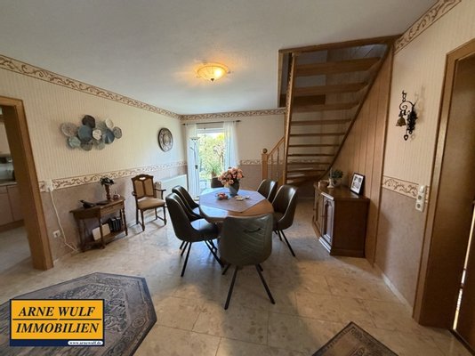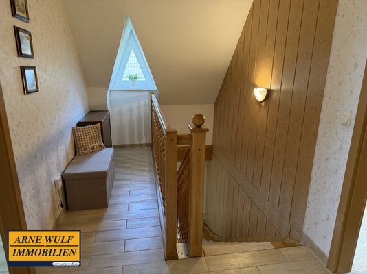 Über den Eingangsbereich gelangen Sie zunächst in den Vorflur. Von hier aus gehen ein Hauswirtschaftsraum sowie ein Duschbad ab. Anschließend betreten Sie die zentrale Wohndiele, die als verbindendes Element des Hauses dient. Von der Diele aus erreichen Sie die Küche mit Einbauküche, das gemütliche Wohnzimmer sowie die Treppe in das ausgebaute Dachgeschoss.