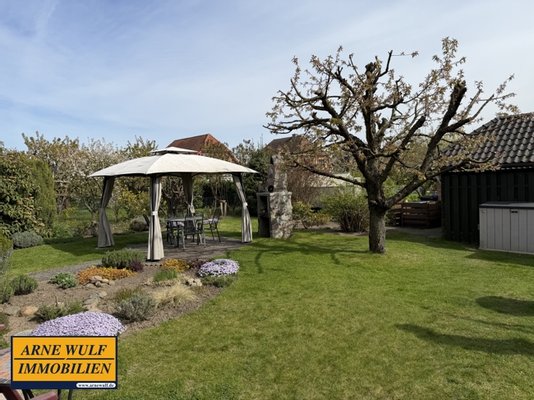 Das Grundstück bietet zahlreiche Möglichkeiten zur Erholung und Nutzung im Freien. Eine Terrasse lädt zum Verweilen ein, diese ist zugänglich über die Küche. Darüber hinaus stehen ein Schuppen für Gartengeräte sowie ein Unterstand derzeit wird hier Kaminholz gelagert. Ein Grillplatz mit Pavillon rundet das Angebot ab.
