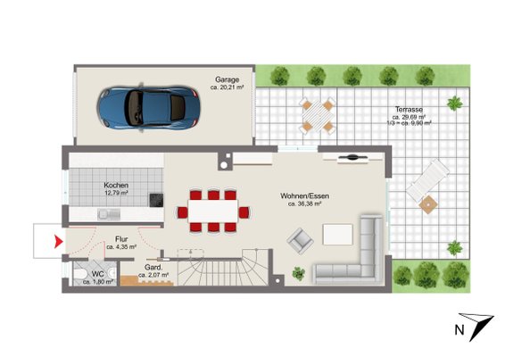 Im Erdgeschoss erwartet Sie ein offenes Wohnkonzept, das Wohnen, Kochen und Essen nahtlos miteinander verbindet. Ergänzt wird diese Ebene durch ein Gäste-WC im Eingangsbereich. Die angrenzende Terrasse mit einer Fläche von ca. 30 m² erweitert den Wohnraum ins Freie und lädt zu entspannten Stunden im Grünen ein.
