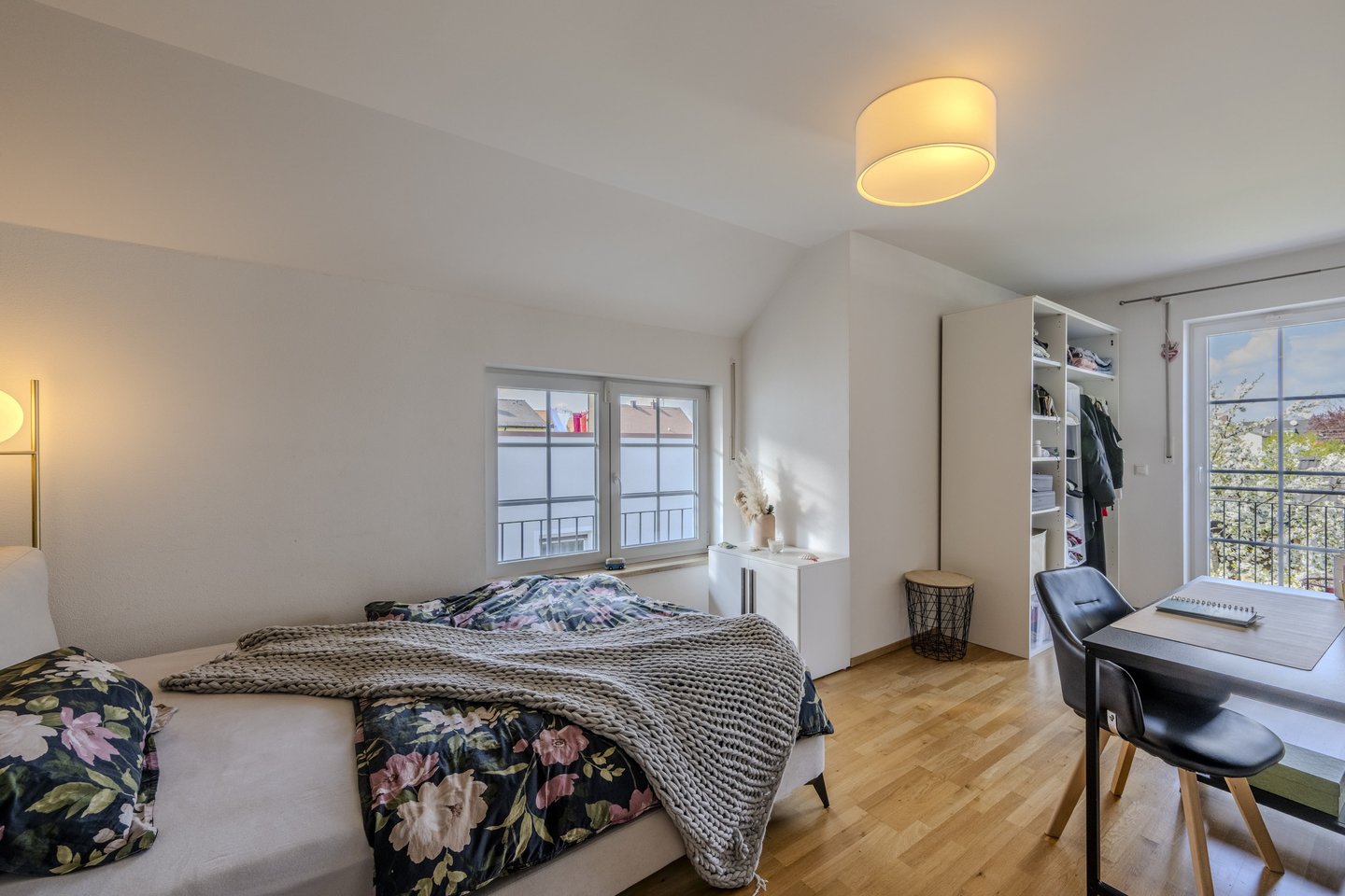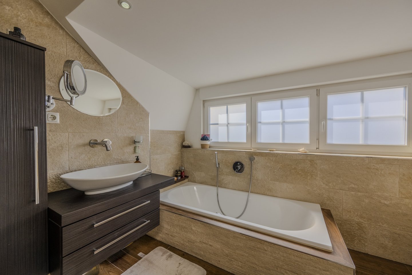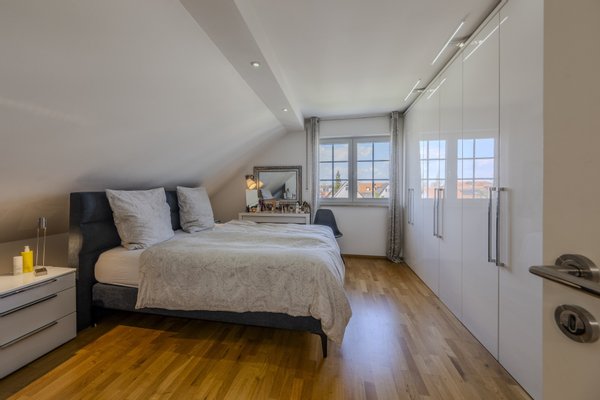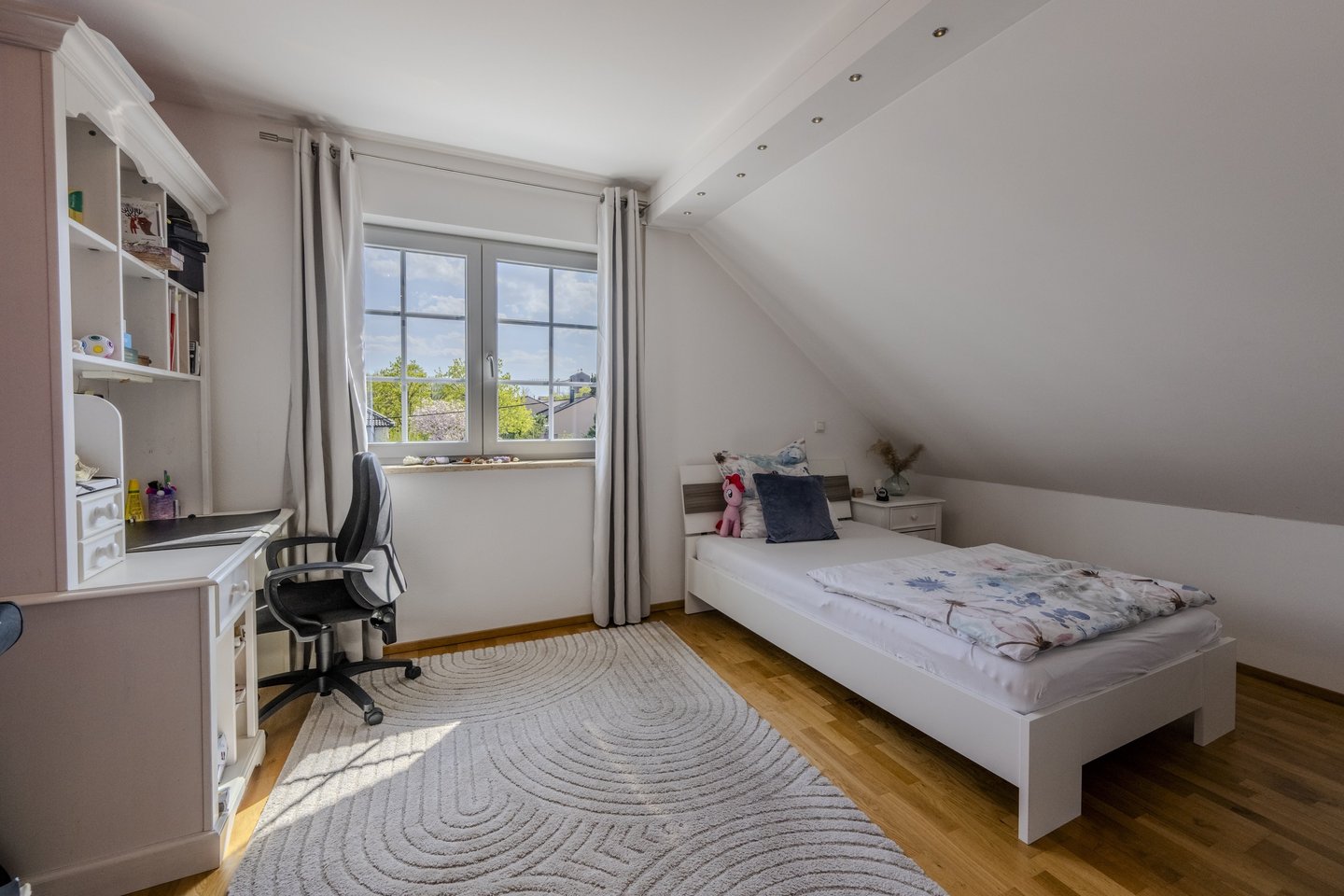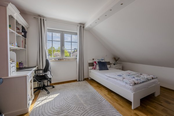 Im Dachgeschoss eröffnet sich ein weiteres Highlight: Ein geräumiges und helles Schlafzimmer bietet einen wunderbaren Blick in den Garten. Zudem steht hier ein weiteres hochwertiges Badezimmer mit Waschbecken, WC, Badewanne und ebenerdiger Dusche zur Verfügung. Ein zusätzliches Schlafzimmer mit ca. 13 m² kann als Gästezimmer oder Arbeitszimmer genutzt werden.