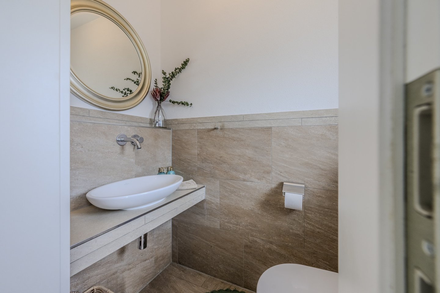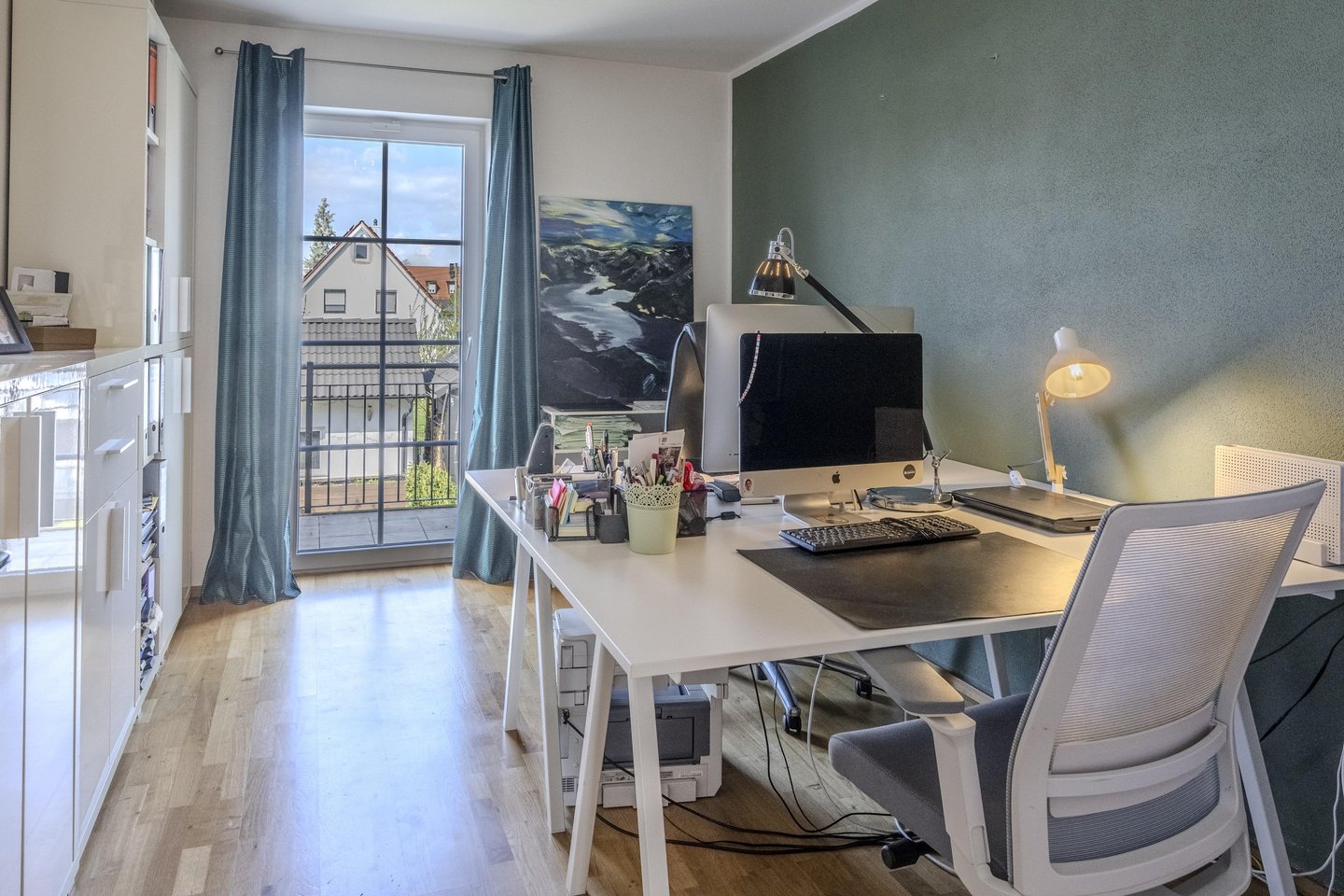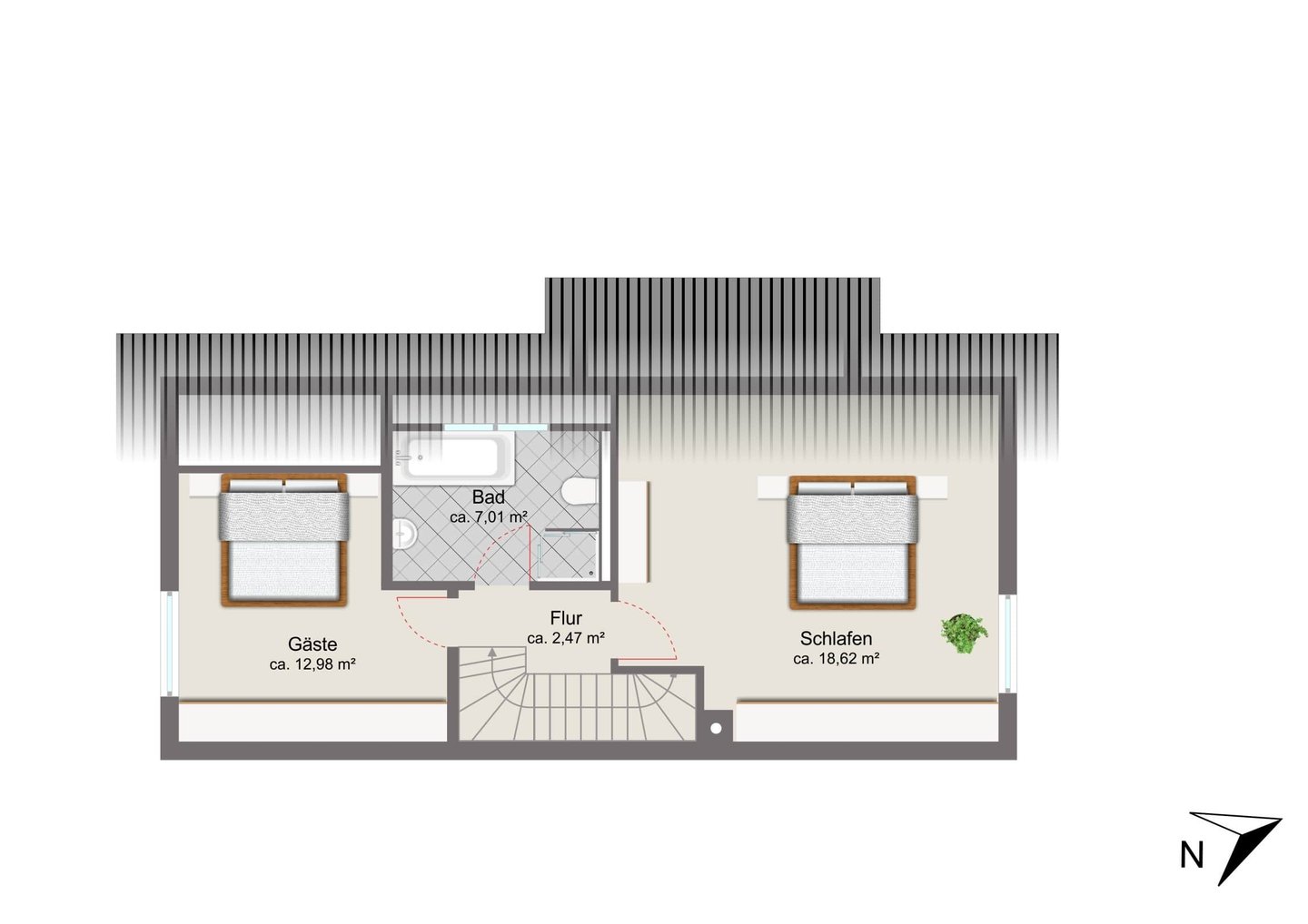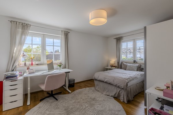 Im Dachgeschoss eröffnet sich ein weiteres Highlight: Ein geräumiges und helles Schlafzimmer bietet einen wunderbaren Blick in den Garten. Zudem steht hier ein weiteres hochwertiges Badezimmer mit Waschbecken, WC, Badewanne und ebenerdiger Dusche zur Verfügung. Ein zusätzliches Schlafzimmer mit ca. 13 m² kann als Gästezimmer oder Arbeitszimmer genutzt werden.