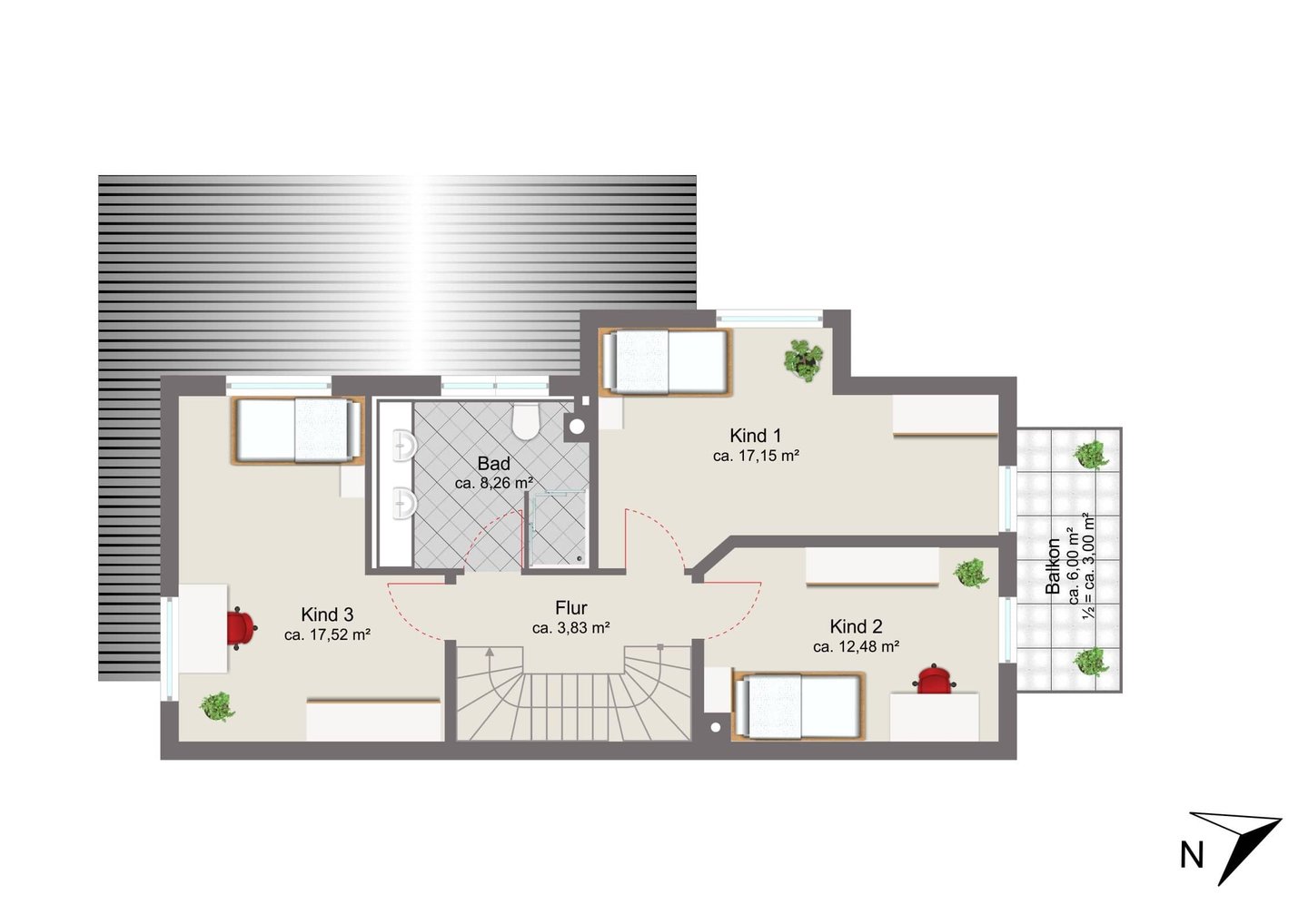 Das Obergeschoss setzt den zeitgemäßen Wohnstil konsequent fort. Neben einem großzügigen Flur befinden sich hier drei Schlafzimmer ( davon haben 2 Zimmer einen Zugang zum Balkon) sowie ein komfortables Masterbad mit 2 Waschbecken, WC und begehbarer Dusche – ideal für Familien.