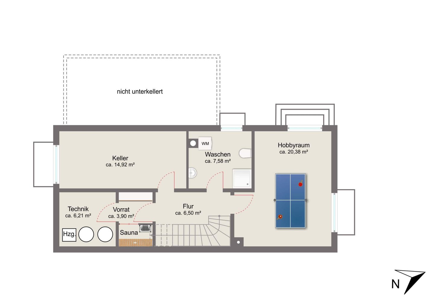 Das Kellergeschoss verfügt über einen einen großen Hobbyraum (derzeit als Sportraum genutzt). In einem abgetrennten Bereich erwartet Sie eine Infrarot-Sauna. Praktisch ist die zusätzliche Nasszelle mit Dusche, Waschbecken und WC im Waschkeller.