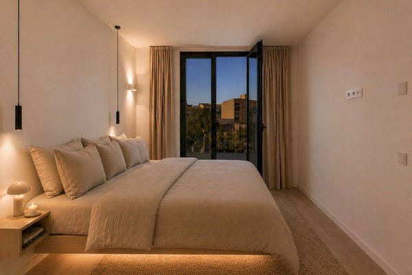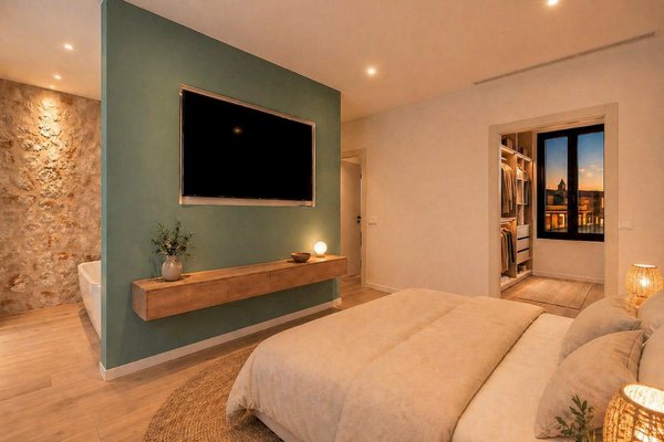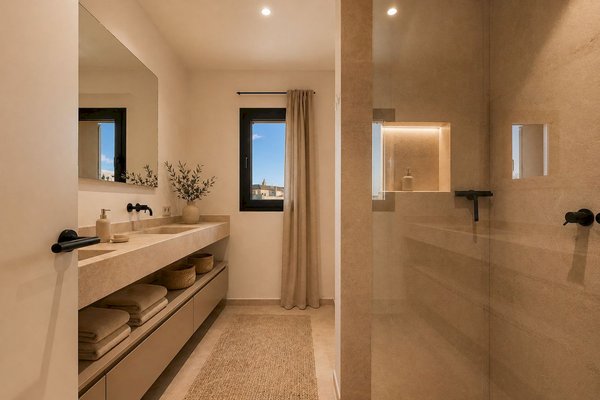 Insgesamt 4 Schlafzimmer und 3 Badezimmer (zwei davon en suite) bieten komfortable Rückzugsorte. Die Master-Suite mit Bad en suite und Ankleide erfüllt höchste Ansprüche. Sie verfügt zudem über eine großzügige Dachterrasse mit weitem Blick über Santanyí.
