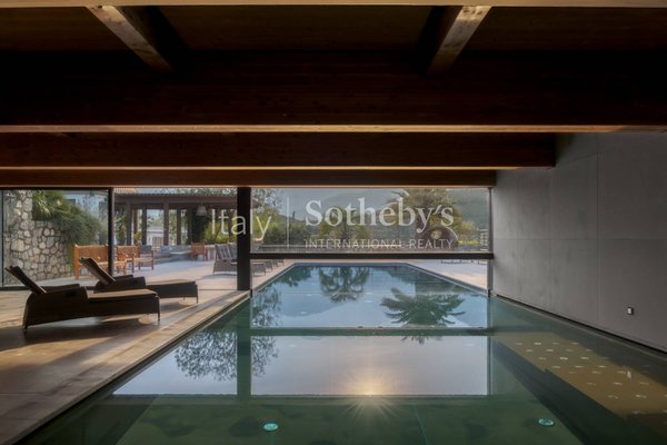 Im Außenbereich öffnet sich ein eleganter Indoor-/Outdoor-Pool zu einem wirkungsvoll gestalteten Innenhof mit Treppenanlagen, Brunnen und hochwertigen Zierbepflanzungen.