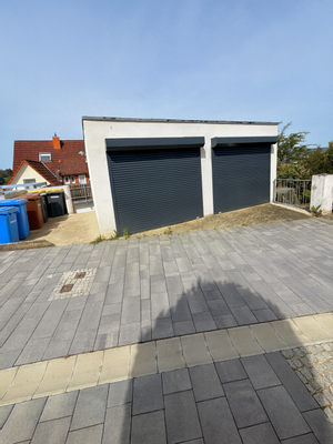 Smart-Parking-Erträge: Das separate Garagengebäude (unten Wohnen, oben Doppelgaragen) ist ein Renditebeschleuniger. Die Tore der Doppelgaragen sind modern via App steuerbar – ein Premium-Feature, das überdurchschnittliche Stellplatzmieten ermöglicht.