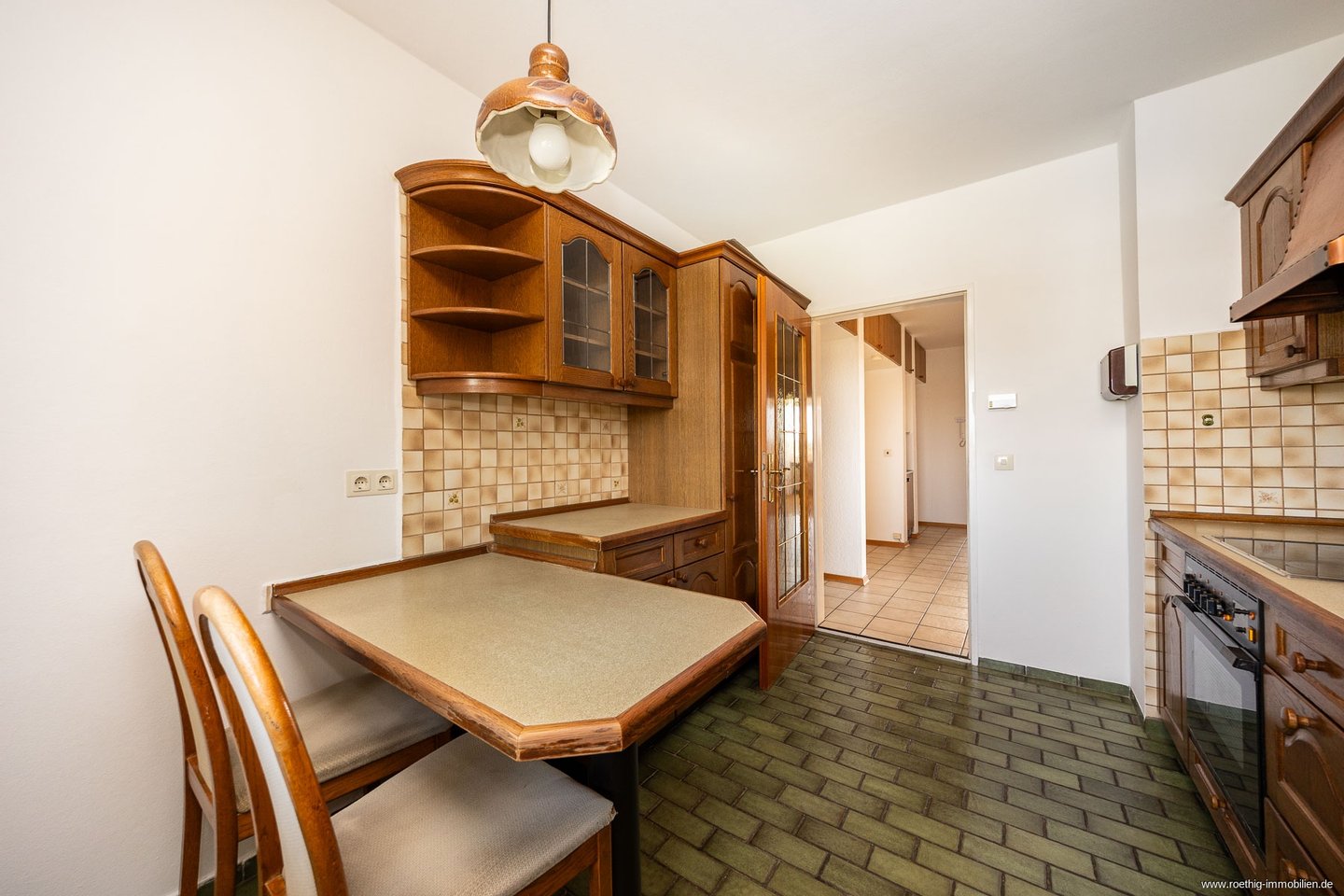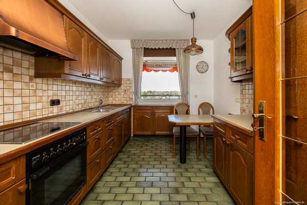 Rechter Hand vom Flur liegt die ca. 10 m² große Wohnküche mit gepflegter Einbauküche und allen technischen Geräten. Das Fenster in Richtung Balkon bietet nicht nur eine tolle Aussicht, sondern fungiert gleichzeitig als praktische Durchreiche.