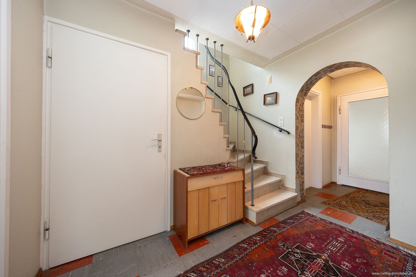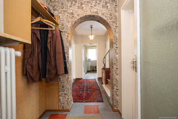 Ein einladender Flurbereich mit charakteristischem Rundbogen-Element verleiht dem Erdgeschoss eine besondere Raumwirkung und verbindet alle Bereiche dieser Ebene auf elegante Weise. Auf der rechten Seite befindet sich ein Gäste-WC mit breitem Fenster zum Vorgarten.