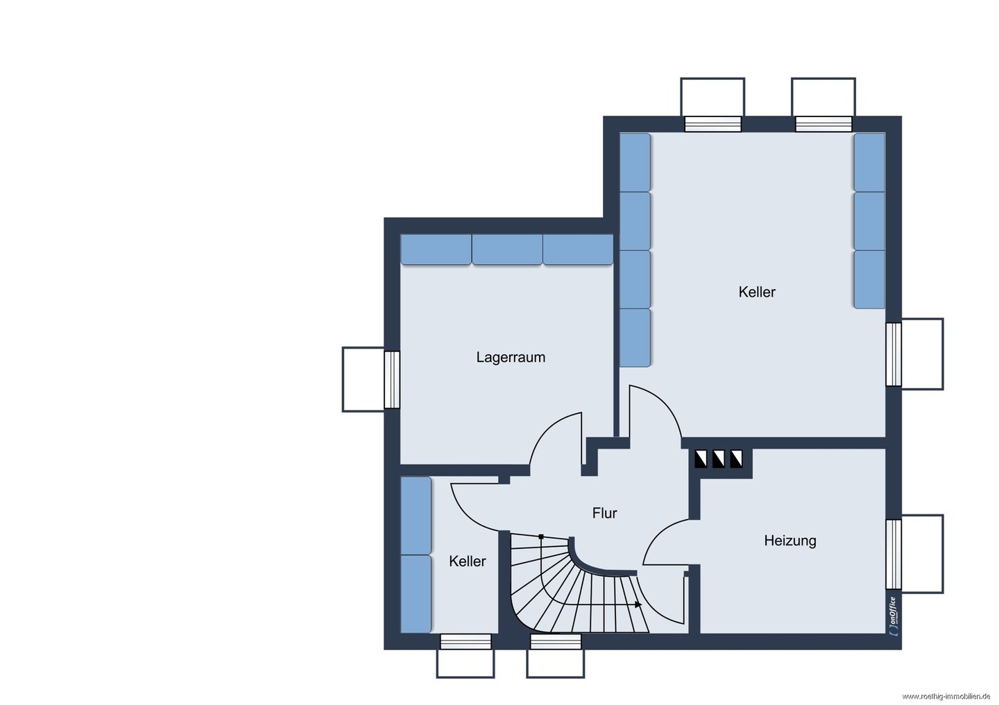Im Untergeschoss des Gebäudes befinden sich zudem drei große Kellerräume sowie der Heizungsraum.