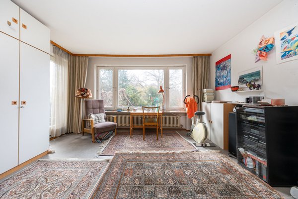 Ergänzt wird das Raumangebot des Obergeschosses durch einen dritten Raum mit großem Fenster in Westausrichtung, der sich ideal als Gästezimmer oder ruhiger Arbeitsbereich eignet und einen angenehmen Blick in den westlichen Teil des Gartens bietet.