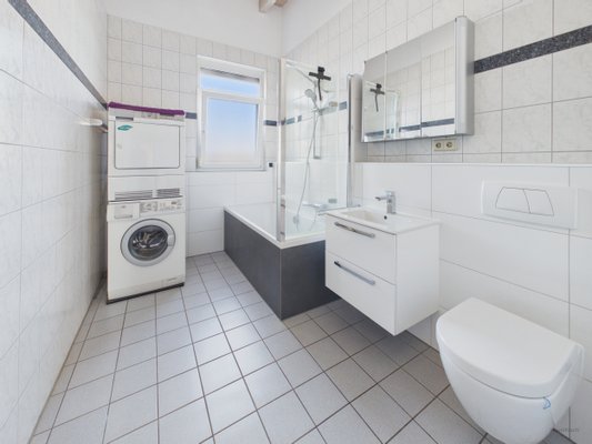 Das Badezimmer verfügt über ein Fenster, eine Badewanne mit integrierter Duschfunktion sowie Anschlüsse für Waschmaschine und Trockner. Eine Einbauküche kann optional für 5.000 € übernommen werden.