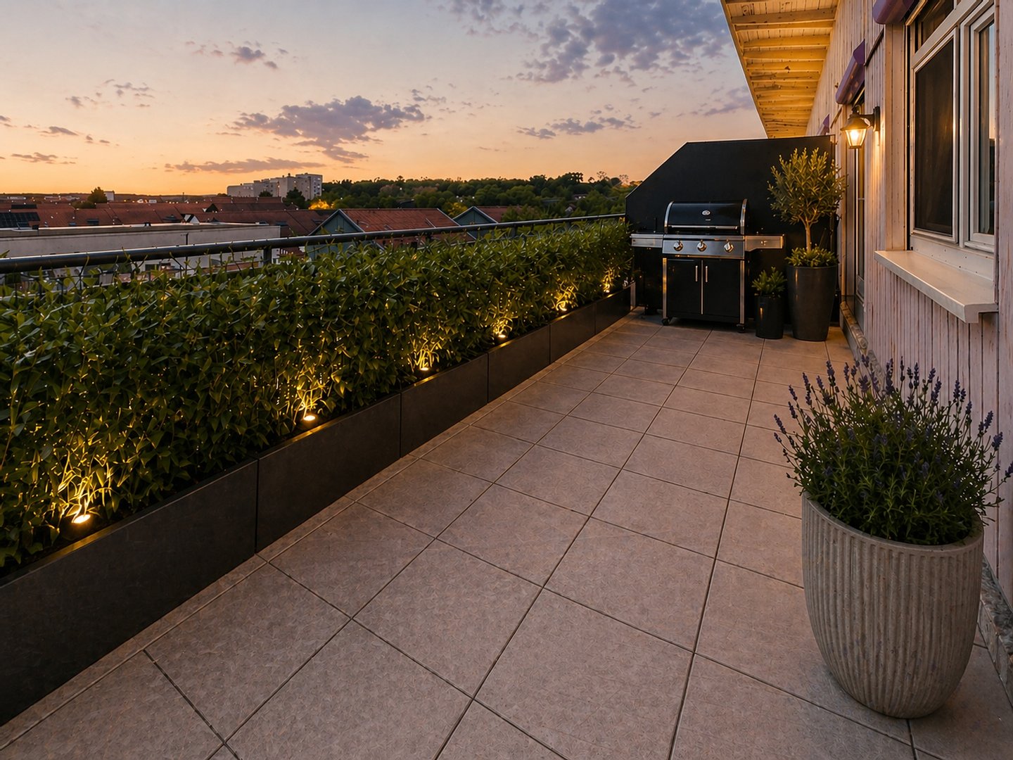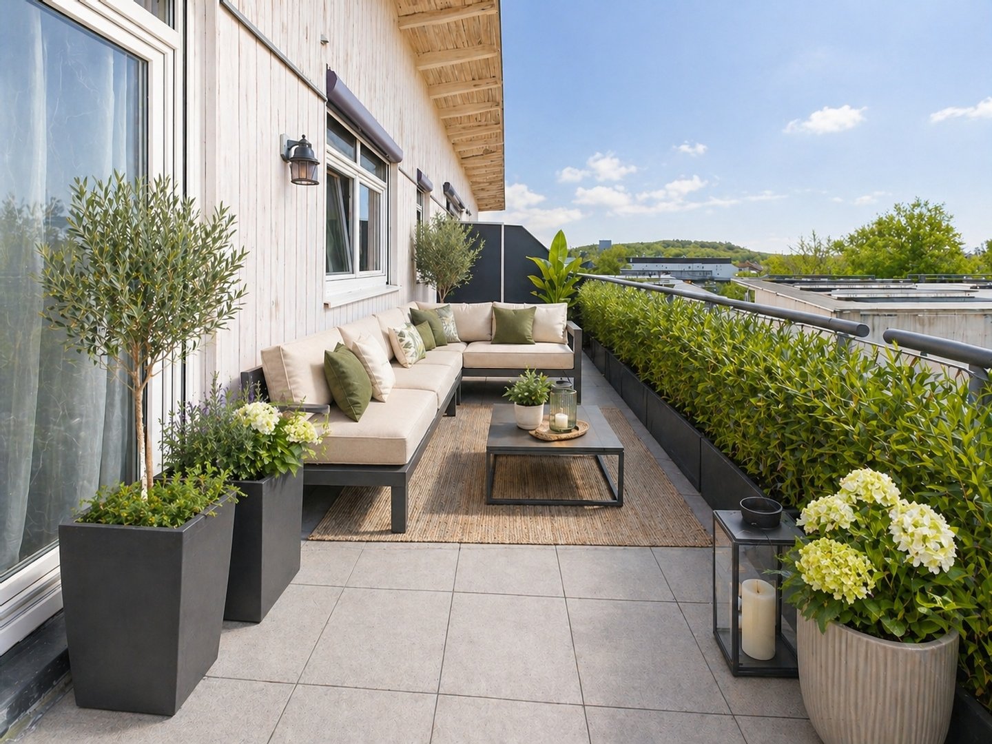 Ein absolutes Highlight ist der großzügige Balkon mit einer Fläche von ca. 21,5 m², der durch seine stabile Bauweise vielseitige Nutzungsmöglichkeiten bietet – selbst das Aufstellen eines Pools ist hier realisierbar. Durch die Lage im obersten Geschoss genießen Sie hier viel Sonne, einen freien Ausblick sowie ein hohes Maß an Privatsphäre.