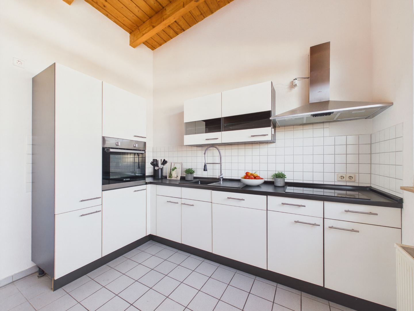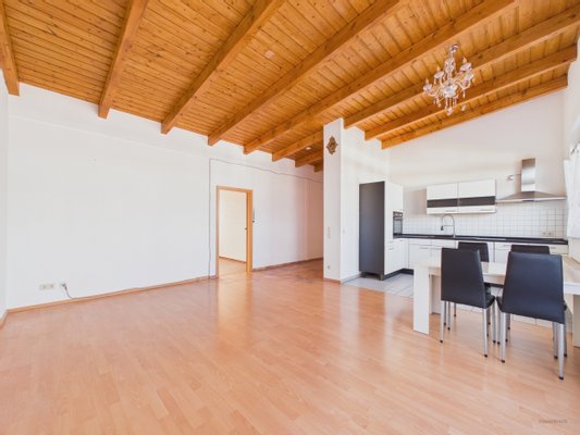 Die Wohnung beeindruckt zusätzlich durch sehr hohe Decken mit sichtbarem Dachstuhl, was ein offenes und modernes Raumgefühl schafft. Große Fensterflächen sorgen für lichtdurchflutete Räume und eine angenehme Wohnatmosphäre.