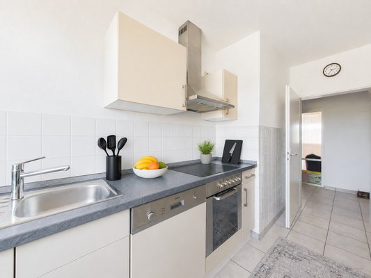 Die vorhandene Einbauküche ist bereits im Kaufpreis enthalten und befindet sich in gutem Zustand. Das Badezimmer verfügt über ein Fenster sowie eine Duschwanne und bietet somit sowohl Tageslicht als auch Komfort. Zusätzlich steht ein separates WC zur Verfügung.
