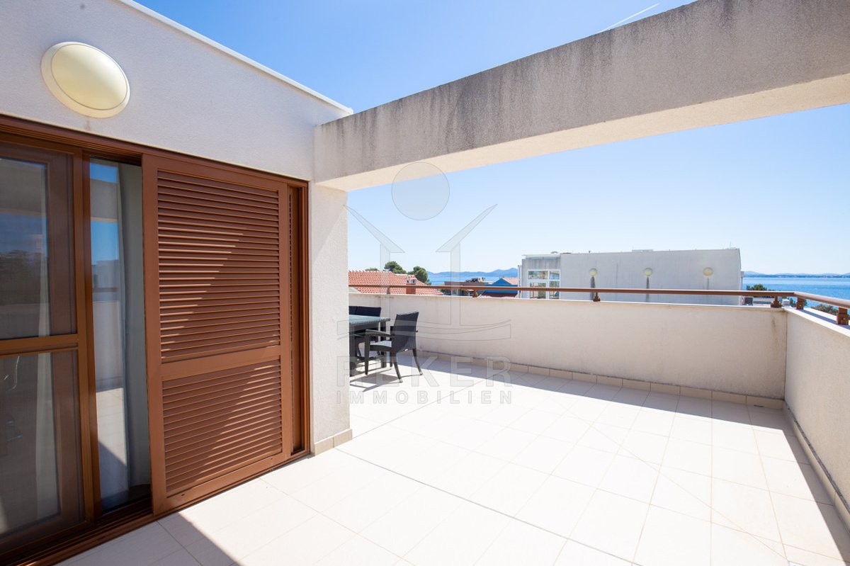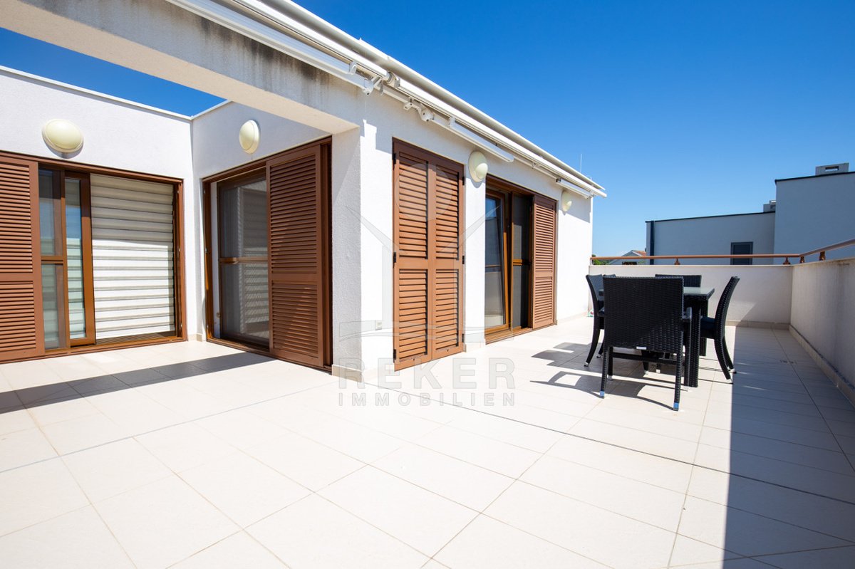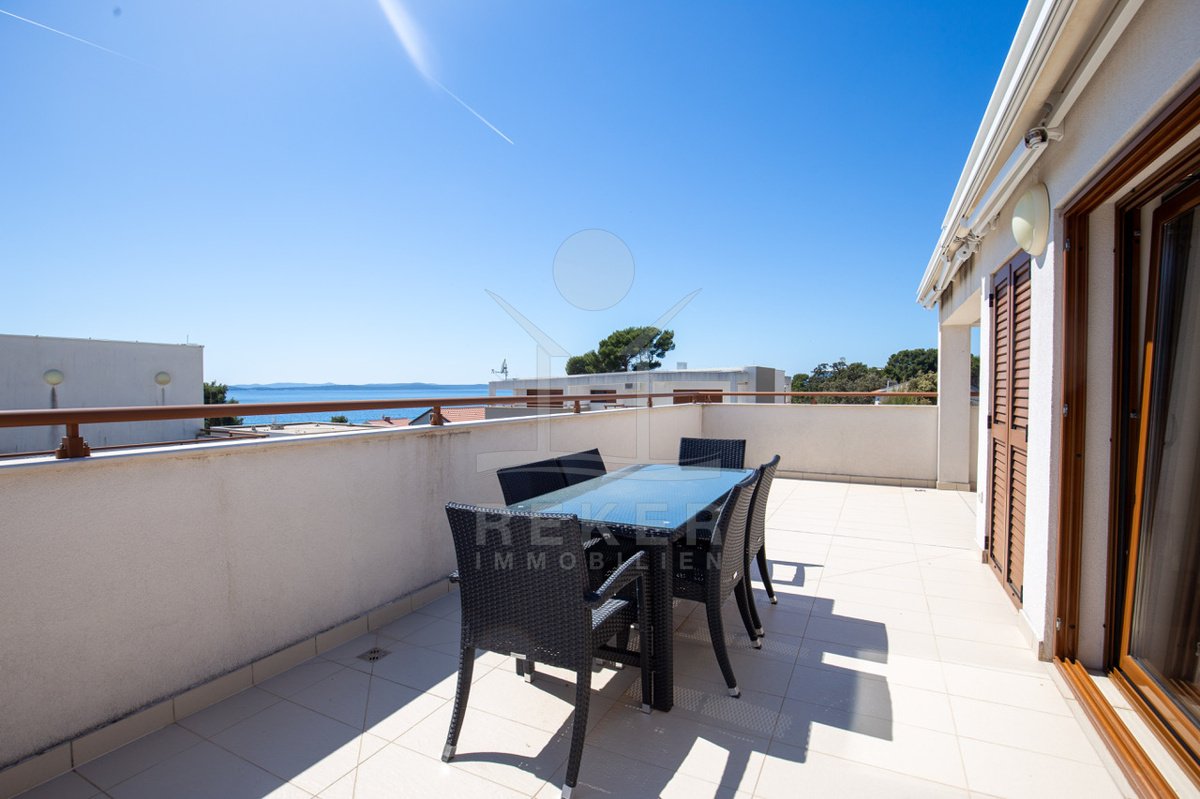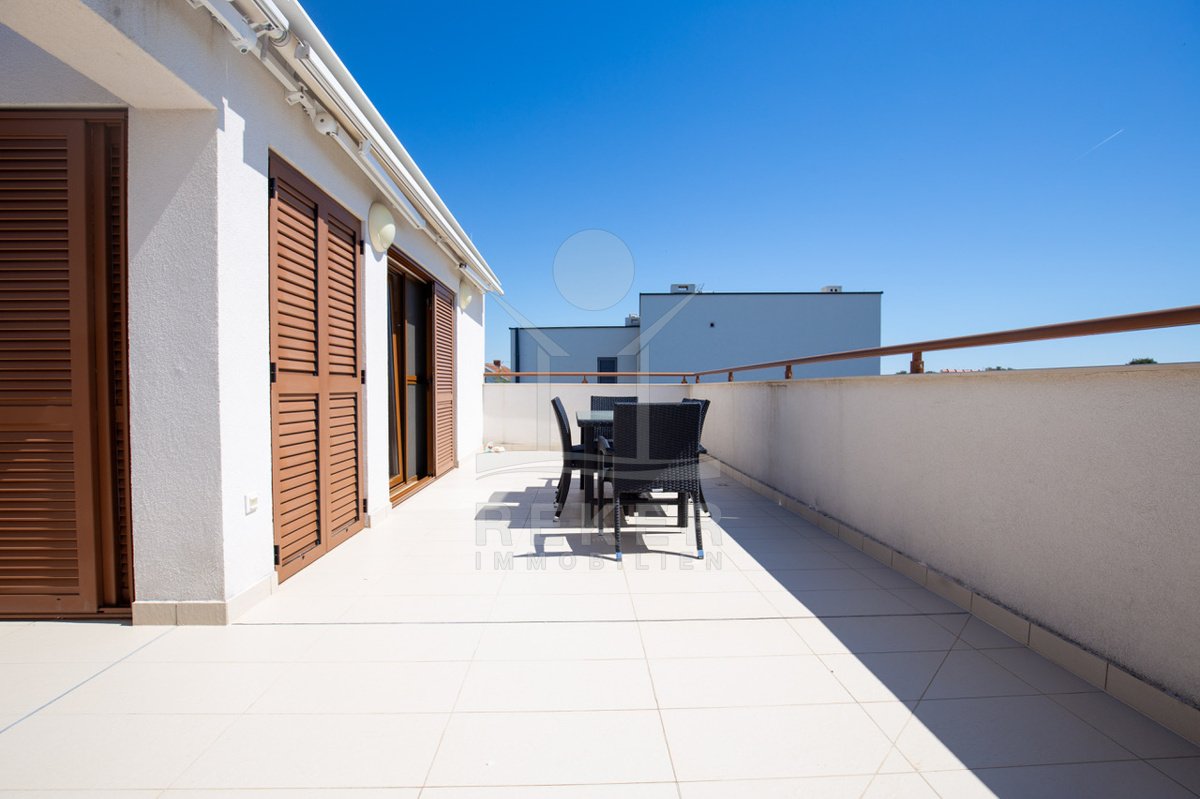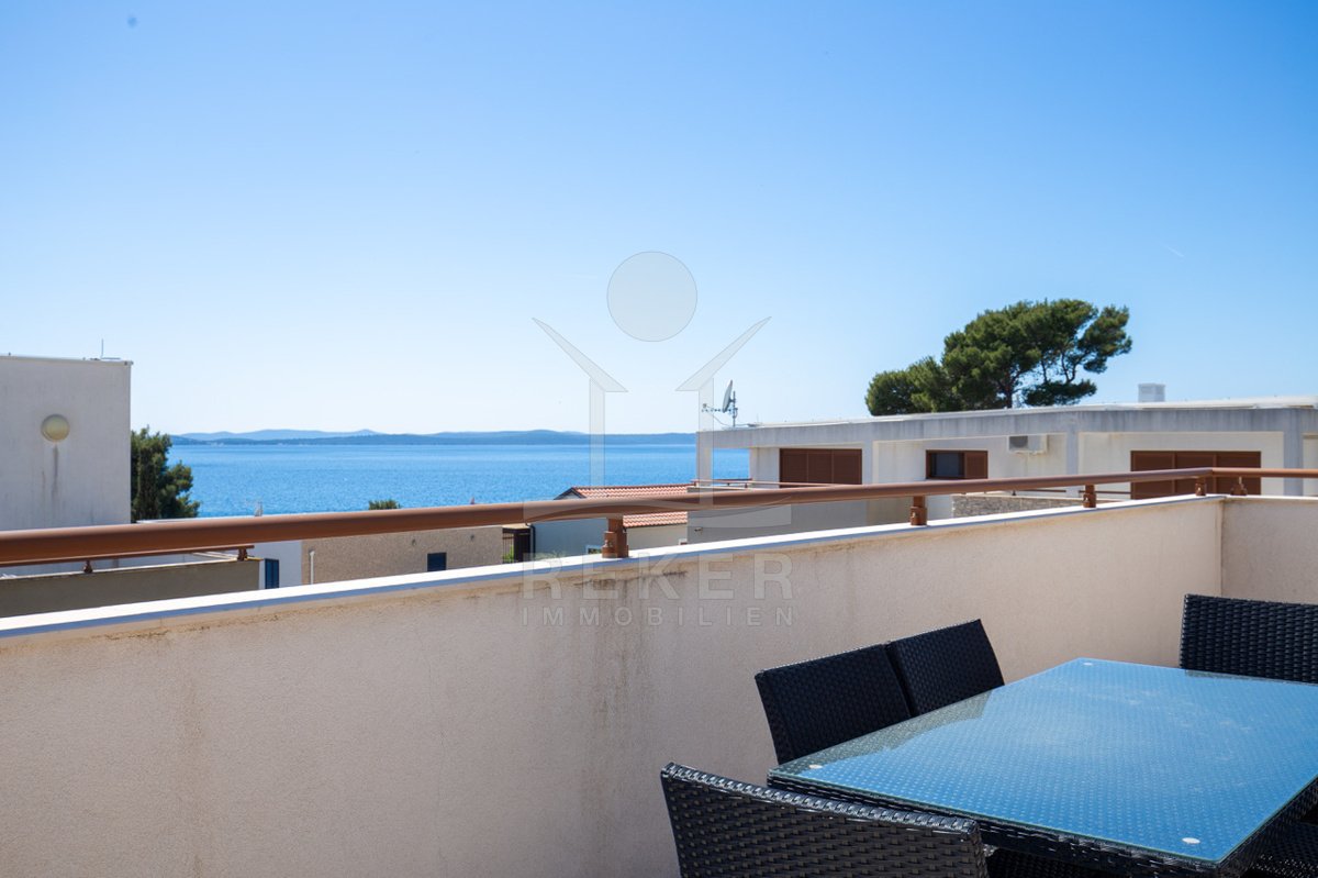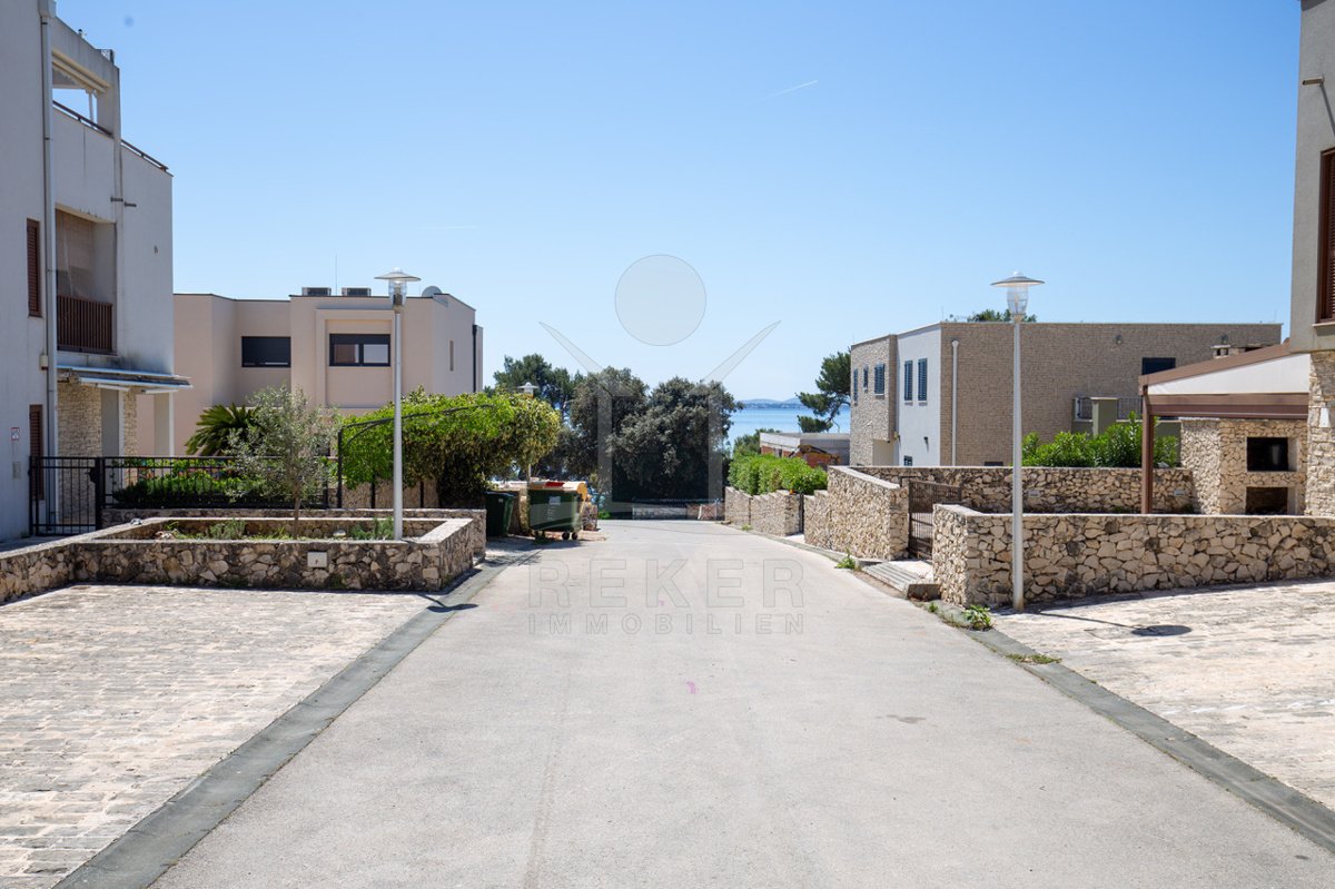 Dieses exklusive Penthouse befindet sich nahe Zadar, in einer ruhigen, grünen Umgebung der Gespanschaft Zadar. Die Küste und der schöne Strand sind nur 100 m entfernt. So erreichen Sie das Ufer in wenigen Schritten. Die Wohnung befindet sich im zweiten Stock eines kleinen, gepflegten Wohnhauses mit insgesamt fünf Wohneinheiten und umfasst die gesamte Etage. Zur Immobilie gehören ein Parkplatz mit 14 m², eine geräumige Tiefgarage mit 30 m² sowie insgesamt drei eigene Parkplätze. Die private Anlage mit kontrollierter Zufahrt über eine Rampe betont den geschützten und exklusiven Charakter.
