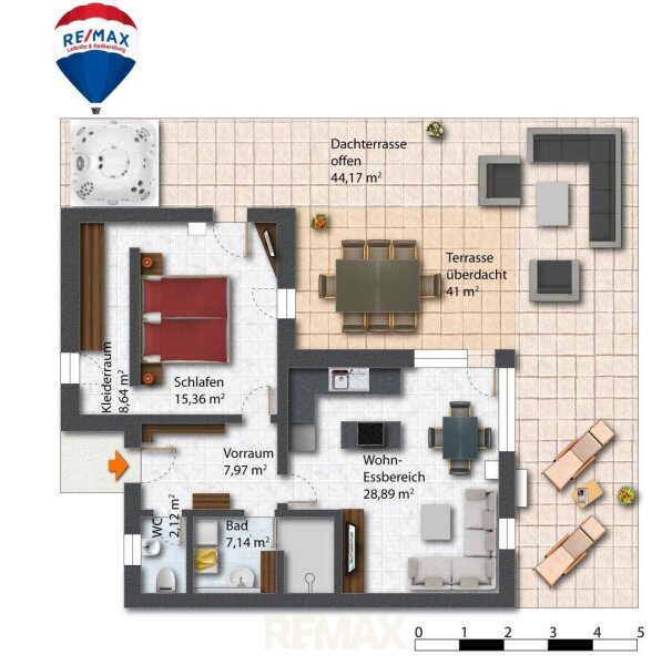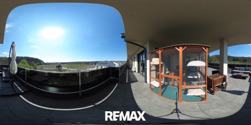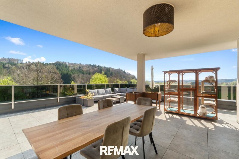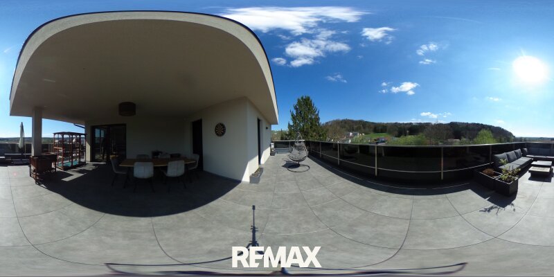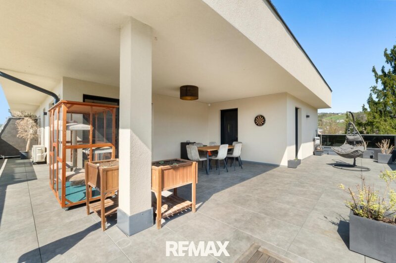 Ein besonderes Highlight stellt zweifellos die rund 85 m² große Dachterrasse dar, welche sich zweiseitig ausrichtet und überwiegend von südöstlicher zu südwestlicher Lage erstreckt. Rund 40 m² davon sind überdacht und bieten somit auch bei wechselnden Witterungsverhältnissen einen geschützten Rückzugsort. Die hochwertige Ausführung mit erhöhten Niro-Geländern in Kombination mit elegantem Schwarzglas unterstreicht den exklusiven Charakter dieser Außenfläche. Ergänzt wird das Gesamtbild durch einen eigens verstärkten Bereich für einen Jacuzzi inklusive Strom- und Wasseranschluss sowie einer beeindruckenden Aussicht über die Weiten des Schwarzautals.