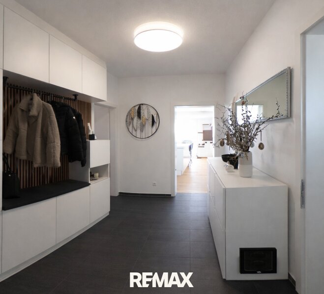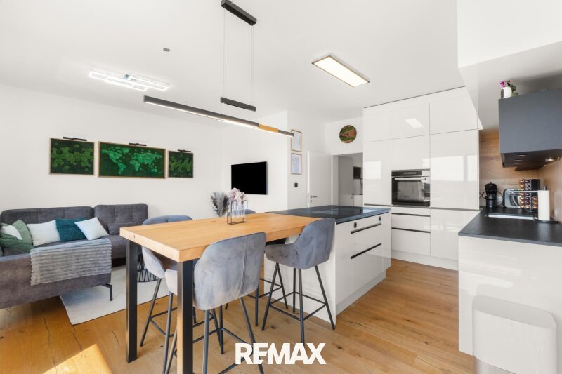 Hochwertige Landhausdielen aus Eiche mit einem außergewöhnlichen Bodenaufbau von rund 70 cm verleihen den Wohnräumen eine warme und zugleich elegante Atmosphäre. In den Sanitär- und Nebenbereichen kommen großformatige Feinsteinzeugfliesen zum Einsatz, während die maßgefertigte Tischlerküche mit Kochinsel und integrierter Wasserfilteranlage den kulinarischen Mittelpunkt der Wohnung bildet.