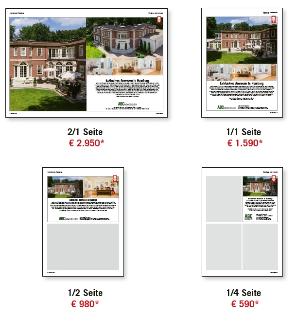 Mit der Galerie-Präsentation bietet BELLEVUE Ihnen die Gelegenheit, jeweils eine besondere Immobilie adäquat zu präsentieren. Zu jedem der vier Galerie-Anzeigenformate gibt es standardisierte Gestaltungsvarianten. Die jeweiligen Formate, Varianten und Preise finden Sie unten zum Download.