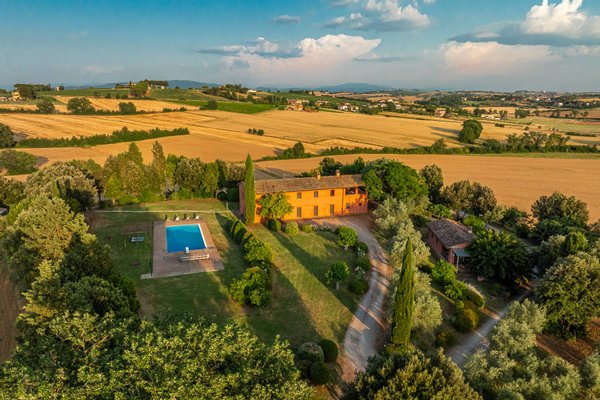 Eingebettet in die umbrische Landschaft, nur wenige Minuten von Perugia und dem Trasimenischen See entfernt, vereint dieses elegante Anwesen von etwa 29 Hektar ländlichen Charme, modernen Komfort und absolute Privatsphäre.Die Hauptvilla mit ca. 460 m² ers