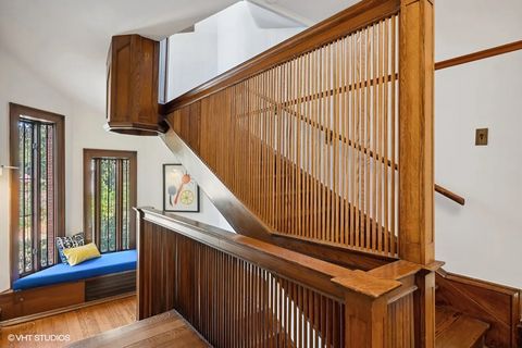 Die Wände der Bibliothek sind mit originalen, von Wright entworfenen Bücherregalen ausgekleidet. Eingebaute Bänke öffnen sich und geben versteckten Stauraum frei. Die Holzarbeiten setzen sich im Wohnzimmer fort. Hier befindet sich eine typische Rückzugsecke mit Fenstersitz. Im zweiten Stock wurden zwei komplette Bäder modernisiert und eine Waschküche hinzugefügt.