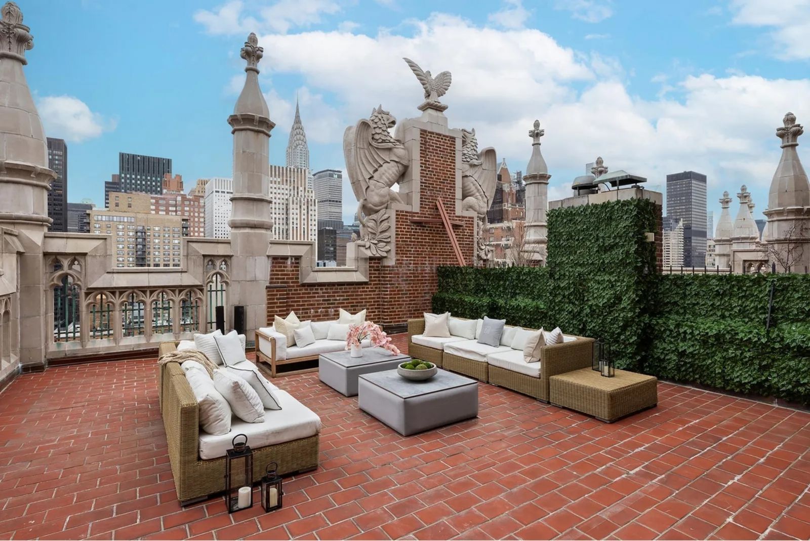 Ganz oben im Windsor Tower befindet sich das angebotene Penthouse (PH4) mit rund 242 Quadratmetern Wohnfläche, zwei Schlafzimmern und zwei Bädern sowie der atemberaubenden privaten Dachterrasse mit etwa 65 Quadratmetern Fläche. Vor allem diese war schon in einigen Hollywoodfilmen zu sehen – darunter im zweiten Teil von „Spider-Man“ oder auch in „Scarface“ mit Al Pacino. Der Anbieter Douglas Elliman bezeichnet die Wohnung als das „Kronjuwel“ von Tudor City.