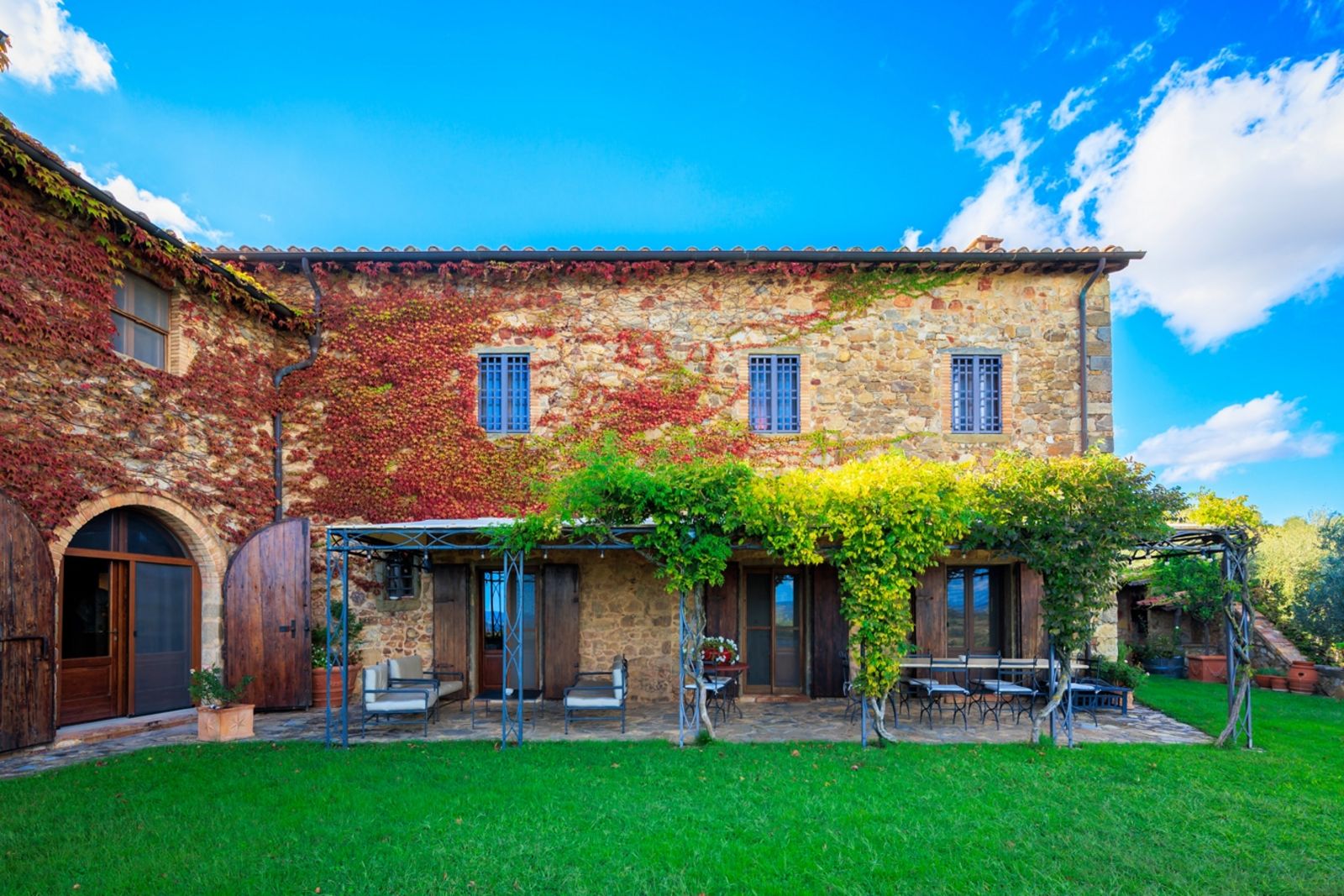 Das Anwesen besteht aus drei Bauernhäusern, die 1998 komplett renoviert wurden. Sie bieten eine Gesamtfläche von etwa 920 Quadratmetern, einschließlich Lagerräumen und Olivenmühle. Das Haupthaus verfügt über circa 650 Quadratmeter Wohnfläche. Unter hohen Standards restauriert, blieb der historische Charme erhalten. Hier befinden sich verschiedene Bereiche – vom Wohnzimmer übers Ess- und Arbeitszimmer bis zum Fernsehzimmer. Im Erdgeschoss kommen ein Gästebad und eine große Küche mit Speisekammer hinzu. Das Obergeschoss bietet ausreichend Platz für sieben Schlafzimmer (einige mit begehbaren Kleiderschränken und Balkonen), ein Arbeitszimmer und sieben Bäder.