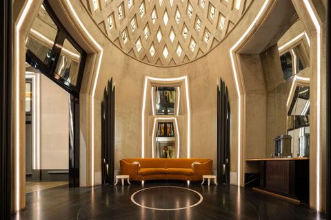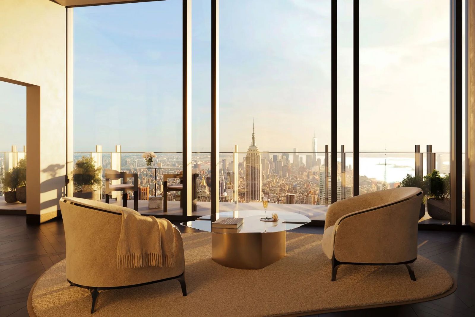 Darin befindet sich dieses Penthouse über vier Etagen und Ausmaßen eines kompletten Wohnhauses – also eine Art Haus in Haus mit elf Räumen, davon fünf Schlafzimmer sowie sechs Bäder. Außergewöhnlich ist die Entertainment-Suite, die man mit einem direkten Aufzug erreicht. Hier öffnet sich eine große Empfangshalle mit weißem Macauba-Steinboden, die zum großen Saal mit rauchgrauen massiven Eichenböden führt. Der spektakuläre Blick auf die Skyline New Yorks ist selbstverständlich von allen Räumen aus gegeben. Kein Wunder bei der Höhe.