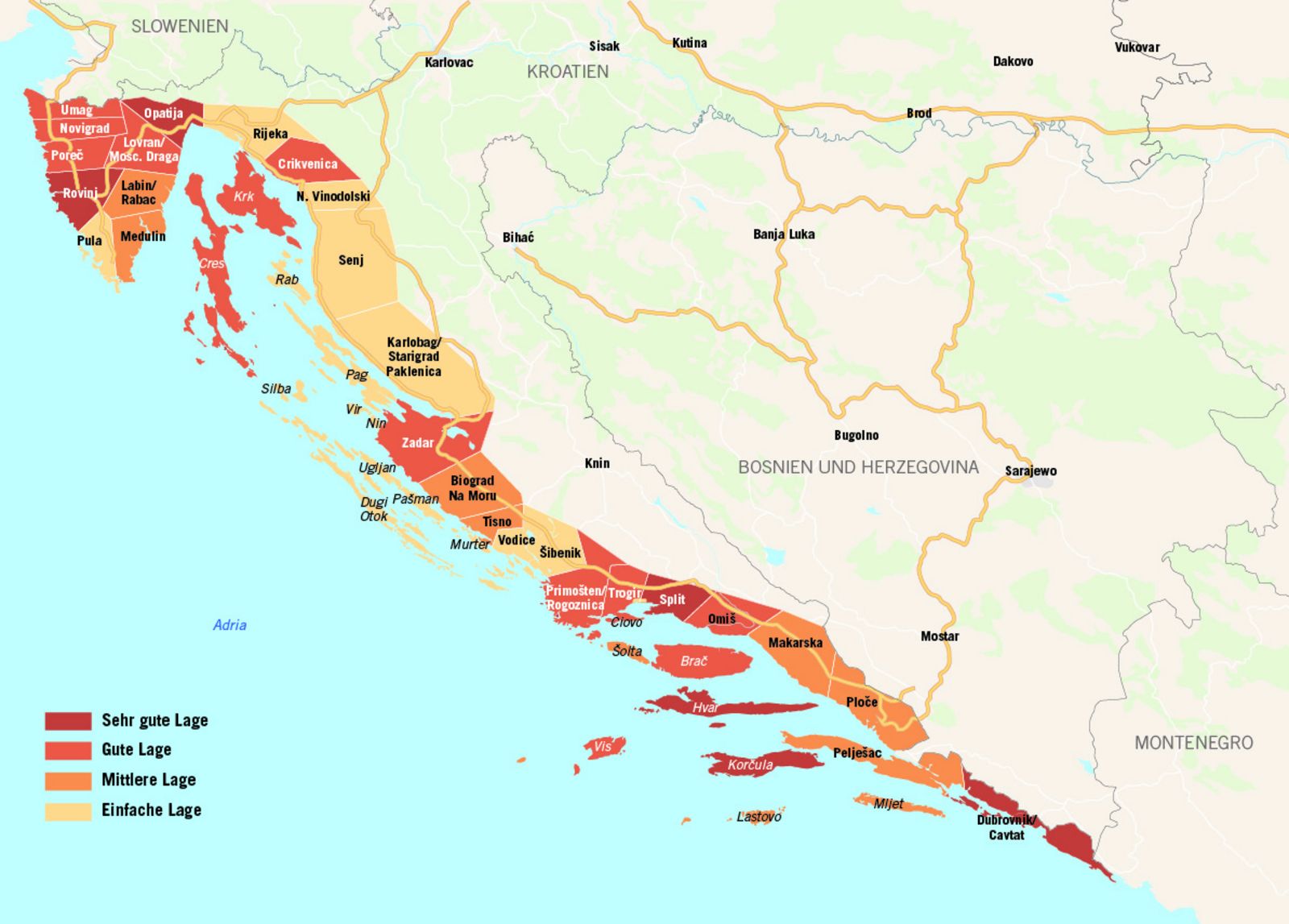 um 75 Prozent teurer kann ein Haus in direkter Meerlage sein als ein gleichwertiges Objekt, das weiter als 300 Meter von der Küste entfernt liegt. Bei Apartments liegt dieser Aufschlag nur bei etwa 46 Prozent (Analyse von Panorama Scouting GmbH). Was weiter als 20 Kilometer von der Küste entfernt liegt, ist als Ferienimmobilie kaum interessant. Und auch die einzelnen Regionen an der Adria zeigen Unterschiede.