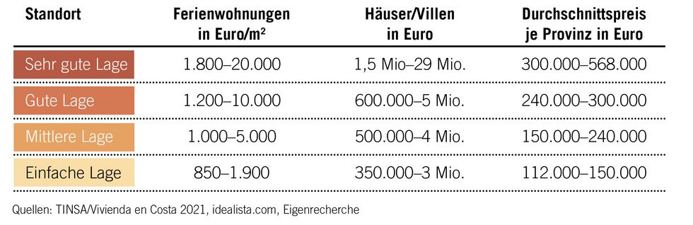 Notar: 0,2 bis 0,5 Prozent des Kaufpreises (offiziell reguliert); Eigentumsregister: üblicherweise 0,1 bis 0,25 Prozent des Kaufpreises; Gestoria: 200 bis 1.000 Euro nach Aufwand. Die Maklercourtage ist in Spanien nicht geregelt. In der Regel zahlt sie der Verkäufer, meist liegt der Satz bei 5 oder 6 Prozent plus IVA. Die Kosten für den Anwalt sind regional unterschiedlich. Das Honorar wird vereinbart. Meist liegt es bei etwa 1.000 bis 2.500 Euro oder 0,5 bis 1 Prozent des Kaufpreises. Die Beauftragung eines Architekten für eine technische Hausinspektion kostet 170 bis 1.800 Euro.
