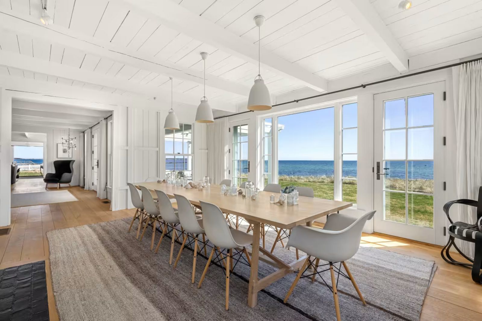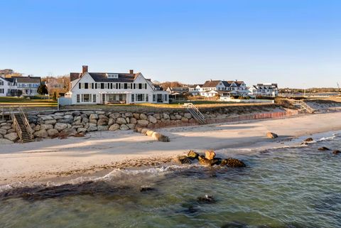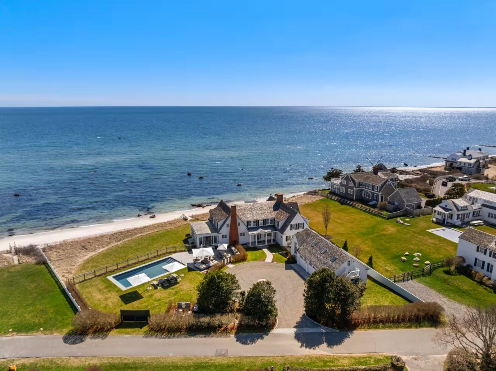 Auf einem Steilhang gelegen, bietet das 1928 im New England-Style erbaute Objekt über 60 Meter eigenen Strand und eine Wohnfläche von rund 465 Quadratmetern. Insgesamt stehen sieben Schlafzimmer zur Verfügung. Hinzu kommen rund 4.450 Quadratmeter Grund mit Pool.