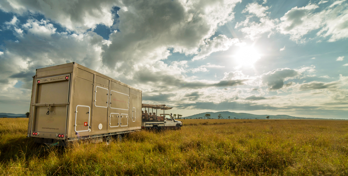 Eine Idee nun, erdacht von dem Züricher Designer und Architekten Andrin Schweizer, setzt dem die Krone auf: Statt, wie bisher, vom stationären Hotel aus im Jeep den „Big Five“ nachzuspüren und allenfalls mal eine Nacht lang im Zelt auf dem Feldbett draußen zu bleiben, nimmt man sein „Hotel“ einfach mit. Claudia und Andrew Stuart heißen die Partner, mit denen Schweizer die Idee umgesetzt hat. Sie sind die Besitzer der Hotelkette „Bushtops Camps Collection“, mit Häusern in Tansania und Kenia – und nun diesem mobilen Safari-Camp aus ausklappbaren Lodges, die einfach hinaus in die Serengeti gefahren werden.