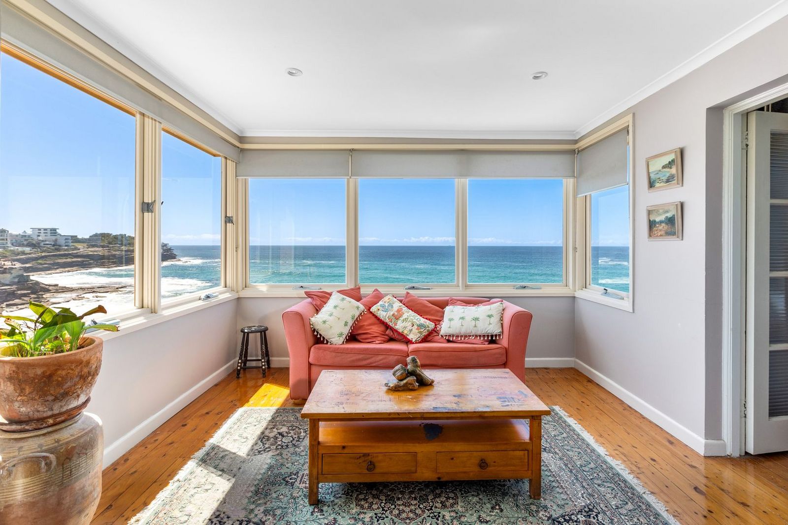 Und genau zwischen diesen beiden berühmten Strandabschnitten, am nicht minder gefragten Tamarama Beach, steht ein Bungalow, der nun zum ersten Mal in seiner fast 100-jährigen Geschichte veräußert wird. In erhöhter Position über dem ikonischen Strand gelegen, gehört das Mirimar Estate seit seiner Errichtung im Jahr 1938 ein und derselben australischen Familie. Im Inneren der rund 320-Quadratmeter großen Immobilie stehen drei Zimmer und zwei Bäder zur Verfügung. Dazu kommen großzügige Wohnbereiche, von denen man den unverbaubaren Meerblick genießen kann. Das Haus ist über einen internen Aufzug mit der darunter liegenden Garage verbunden. Zudem gibt es einen privaten Pool. Und das Grundstück ist mit einem direkten Zugang zum bereits erwähnten Küstenweg verbunden.